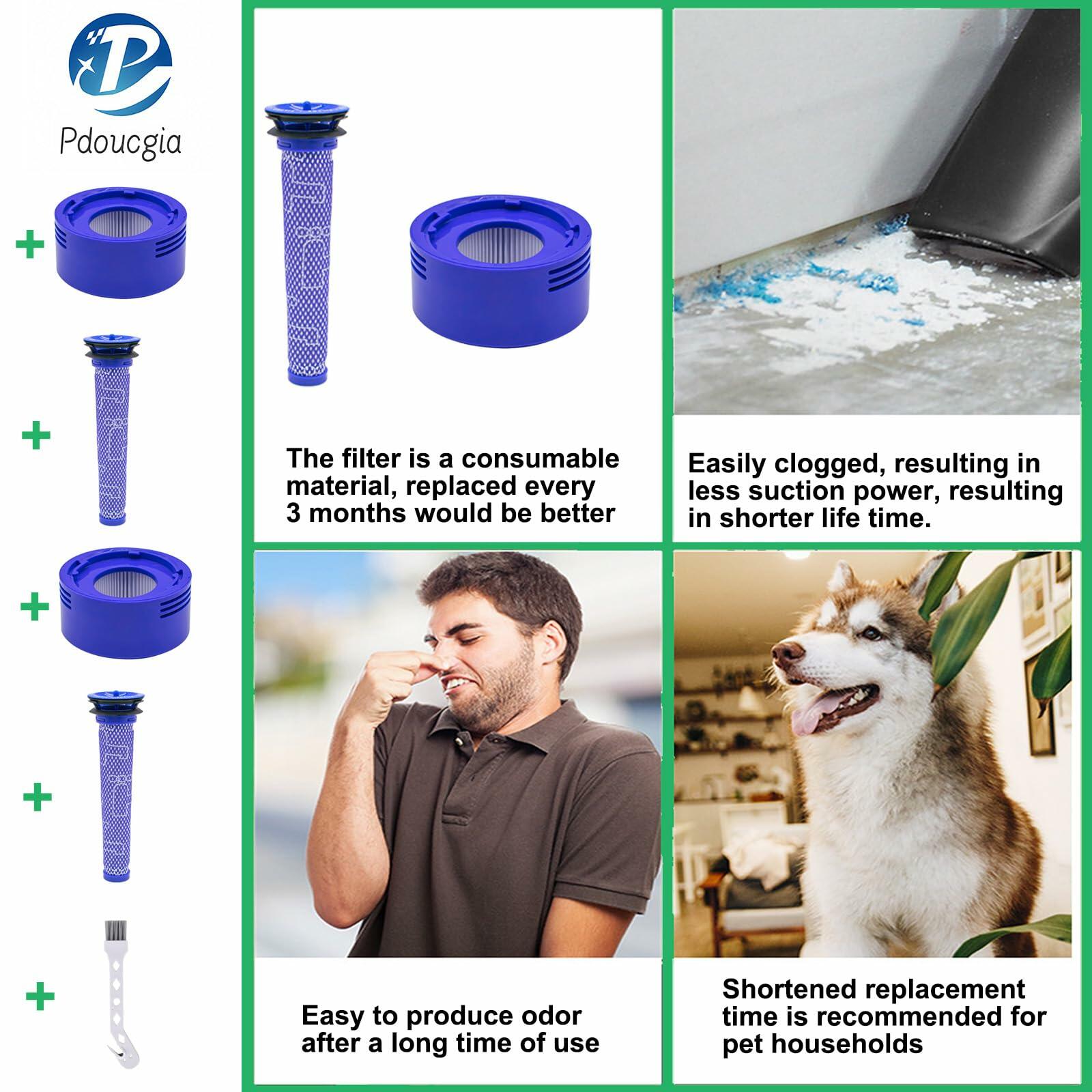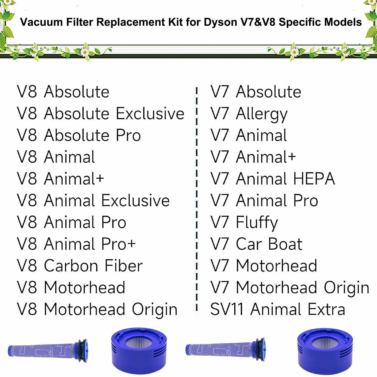 - Pdoucgia Dyson V8 filter replacement kit includes 2 pre-filters, 2 post-filters, and a clean brush, designed for Dyson V8 & V7 models accessories. These filters ensure your Dyson vacuum operates at peak efficiency, capturing dust and allergens for a cleaner home environment.Part To 965661-01/967478-01