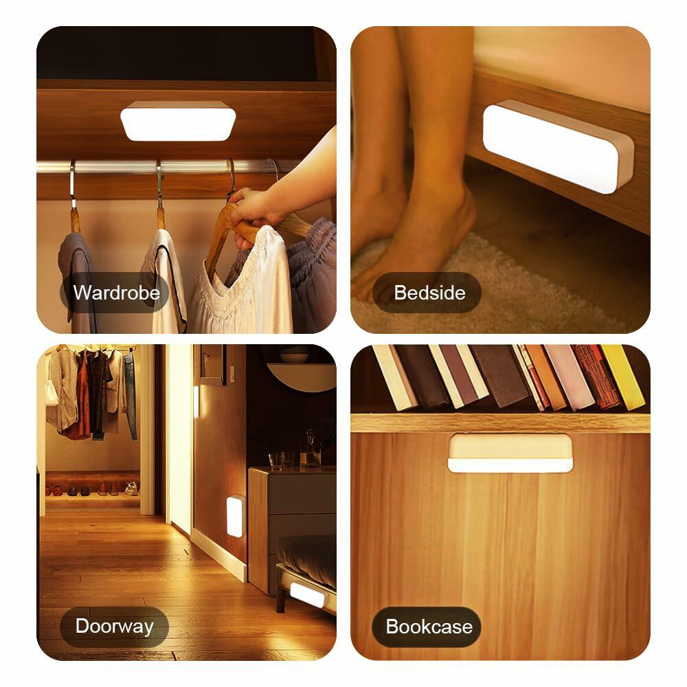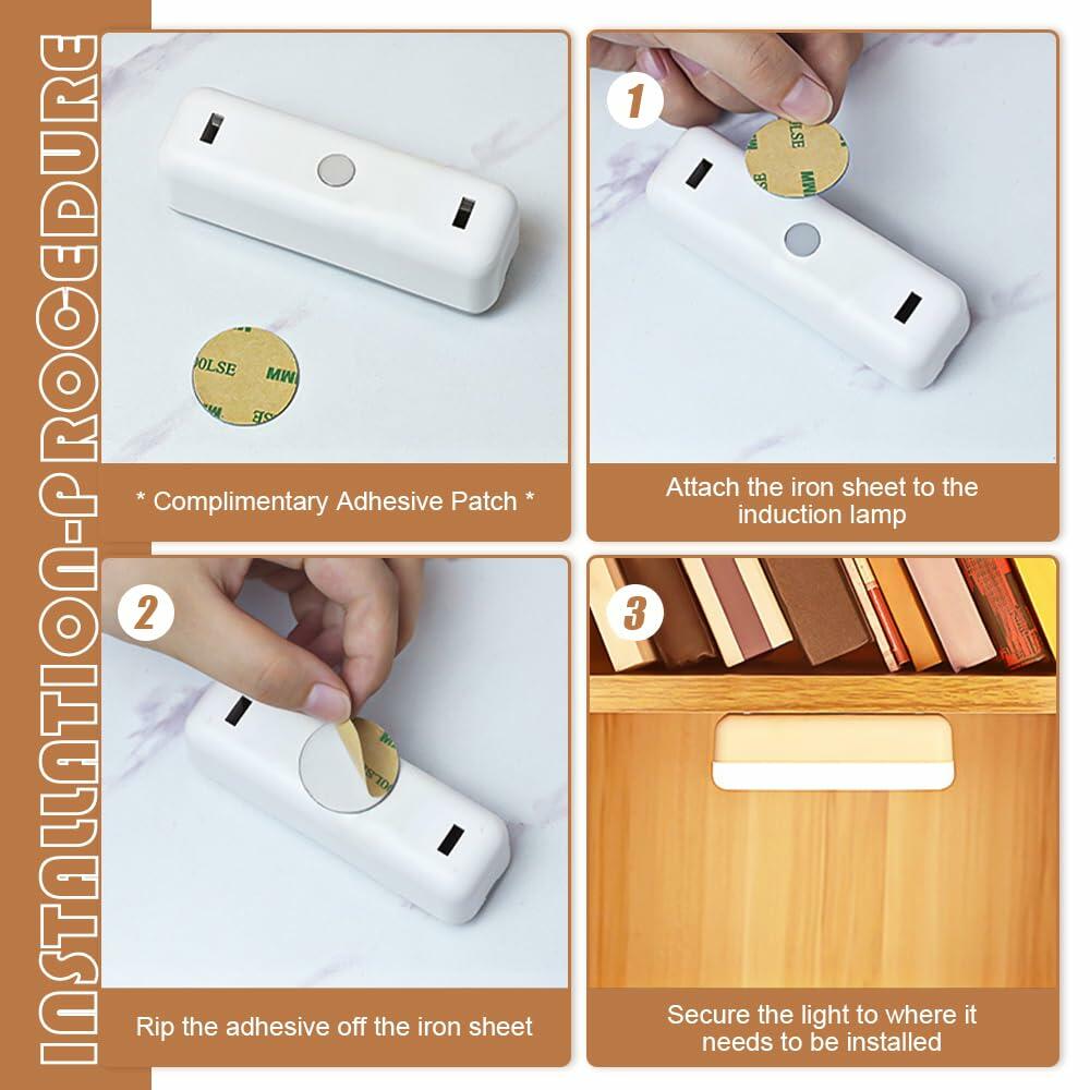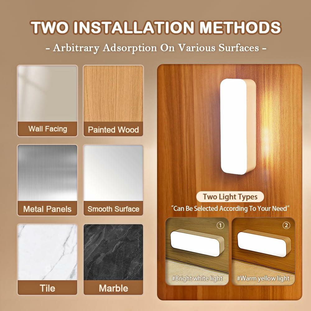 - 【Easy Installation】Motion sensor night light installation no hammer, drilling, or tools needed. It offers 3 installation options: ① Use the built-in magnet to attach it to any magnetic surface. ② Use the included metal sticky plate to stick the night light to the desired location. ③ Hang it directly on existing hooks.