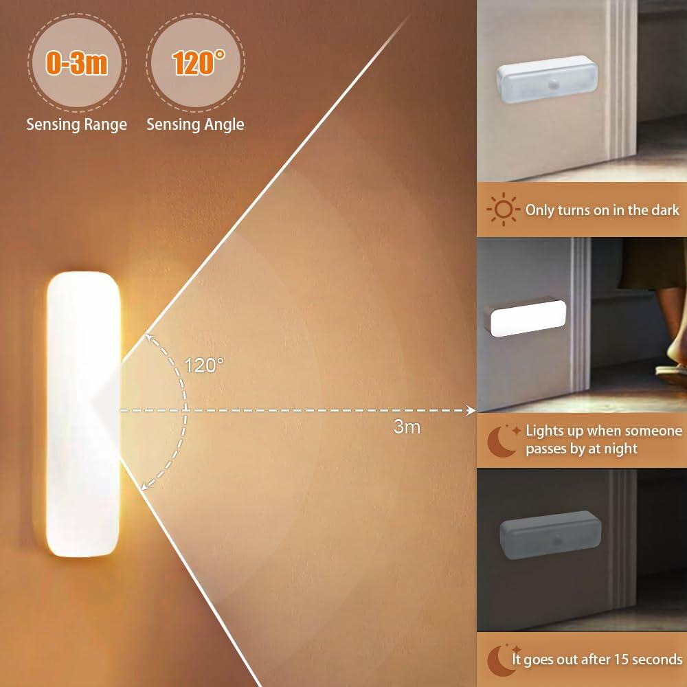 - 【LED Smart Motion Detection】The smart night light can detect motion within a range of 9.8 feet/120°, providing illumination. LED motion sensor light will turn off after 25 seconds if no motion is detected. The light can also be taken off and used as a handheld portable light, with its bar-shaped design for convenient grip.