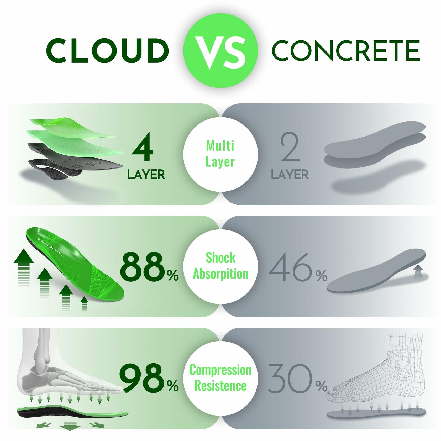 Step into a new realm of comfort with the Bouncy Arch Support shoe insoles from PerserveranX. These orthotic inserts are designed to support your feet and relieve stress all over your lower body, using space-age technology to provide real results and plantar fasciitis relief from our sole insoles. With the material’s open-cell structure, we’ve created something supportive, breathable, and comfortable. Arch support insoles have special foam is made from open cell polyurethane, a form of polyurethane that allows our insoles for plantar fasciitis to perform at their professional-grade level. This particular type of foam has all of the usual properties, providing cushioning and contouring to your feet, but it also takes the technology to a new level. Common memory foam insoles can suffer from compression deformation over time, but ours always bounces back consistently, meaning it stays as good as new forever – and yes, we do mean that literally. This means that there’s no need to replace insoles for a long time, making these shoe inserts a more sustainable choice as well. With our 4-layer design and sophisticated materials, we’ve created shoe insoles that combat various foot conditions while also protecting against knee and joint fatigue. Whether you have flat feet or suffer from arch pain, with one of these in your boot or shoe, those problems will become a thing of the past. If you’re looking for the best plantar fasciitis insert, you’ll struggle to find one better than PerseveranX. These are the kind of shoe inserts men and women can rely on for proper arch support. Take a step in the right direction today – choose Orthotics from PerserveranX.