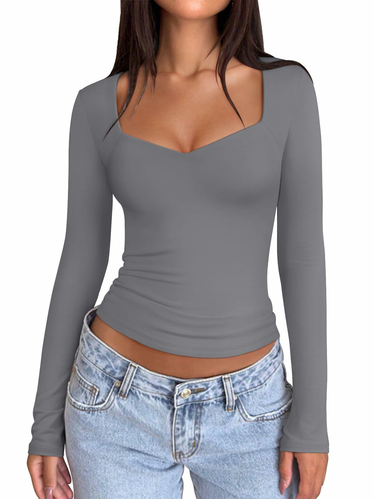 PINKMSTYLE Womens Sexy Square Sweetheart V Neck Tops Double Lined Tees Basic Long Sleeve Slimming Fit T Shirts Fall Tops