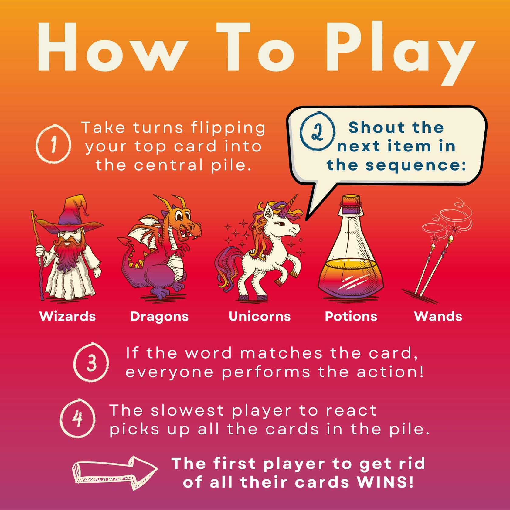 - ๐งโโ๏ธ๐ ๐ฎ๐ด๐ถ๐ฐ๐ฎ๐น ๐ฆ๐ฒ๐พ๐๐ฒ๐ป๐ฐ๐ฒ๐: Players flip cards and recite the sequence: Wizard, Dragon, Unicorn, Potion, Wand. Match the spoken word to the card image and perform the action for a spellbinding time!