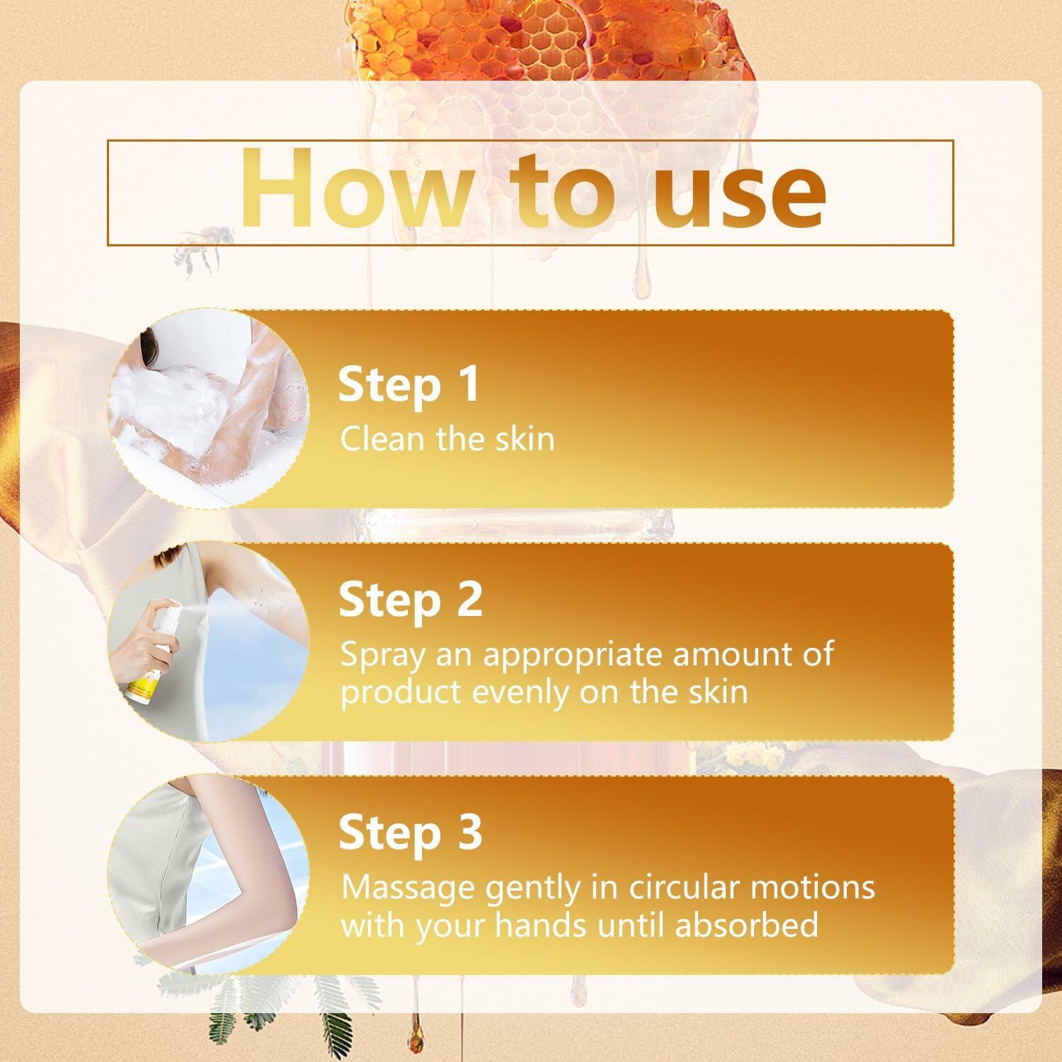 - HOW TO USE: 1. Clean the skin. 2. Spray an appropriate amount of product evenly on the skin. 3. Massage gently in circular motions until absorbed.