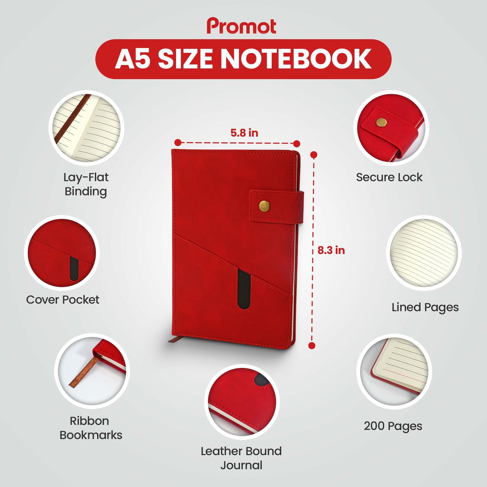 Promot PU Leather A5 Lined Notebook with Pen Red 200 Pages Elastic Pocket