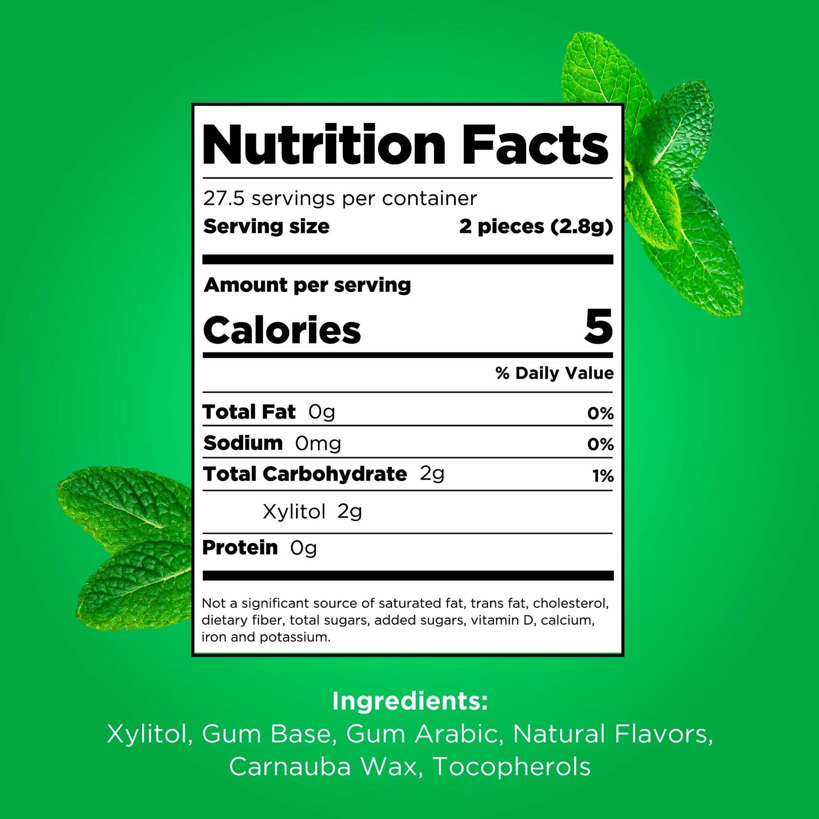 SpearmintThis sugar free gum is refreshing & has a minty flavor to liven your taste buds. Keep your mouth feeling fresh with an intense burst of classic spearmint flavor.Each resealable bag of Spearmint gum contains 55 pieces. PUR gum is also available in Peppermint, Bubblegum, Wintergreen, Cinnamon, Pomegranate Mint, Coolmint, and Chocolate Mint flavors.Our StoryFounded in 2010, PUR was built on the founding principle of making simple substitutions to promote a healthier lifestyle, without compromising taste or quality! With a growing number of dietary restrictions and health-conscious consumers, PUR set out to create products that everyone could safely consume, enjoy and share!Naturally Sweetened with 100% XylitolPUR uses sustainably sourced xylitol. It looks & tastes just like sugar with 40% less calories than sugar while boosting oral health.Try PURTaste our New PUR Popcorn, New PUR Mints, New PUR Jumbo Gum & PUR Blister Gum!