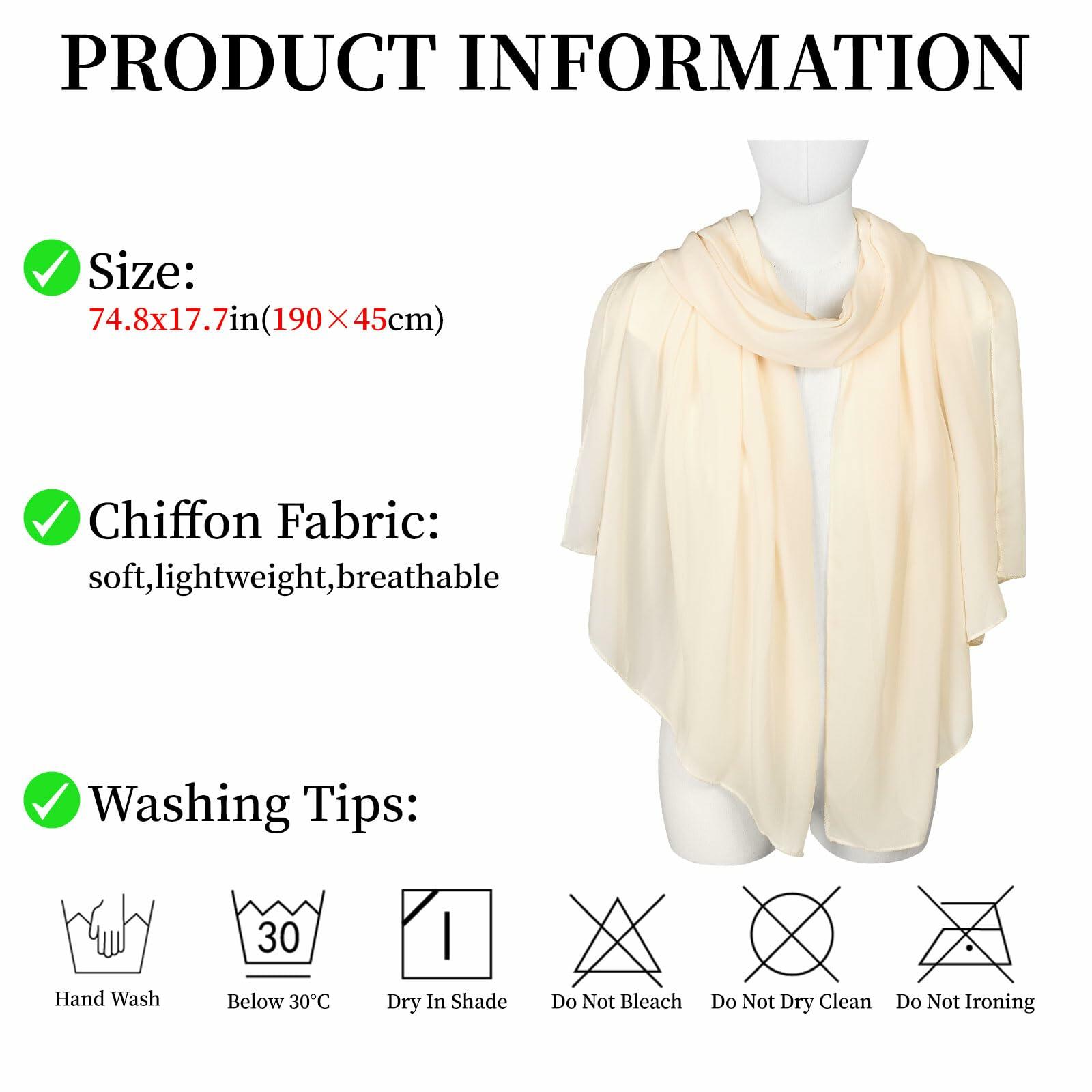 - KIND TIPS - 1. Our chiffon scarf for women are available in two sizes. Please choose the most suitable style according to your needs. 2. Our shoulder wraps for dresses are recommended to be machine washed gently or hand washed in cold water and dried flat in the shade. Do not bleach. Do not use an iron to iron. 3. Due to the different resolutions and settings of each monitor, the color of the shawls for women you receive may be slightly different from the picture, please understand