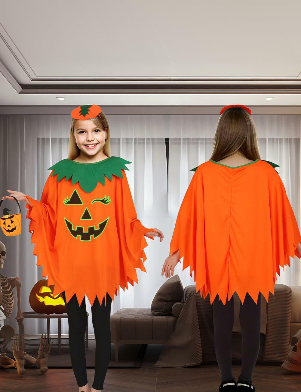 qqpouc Pumpkin Costume Glow in Dark Halloween Poncho Headband Candy Bags 3-7Y