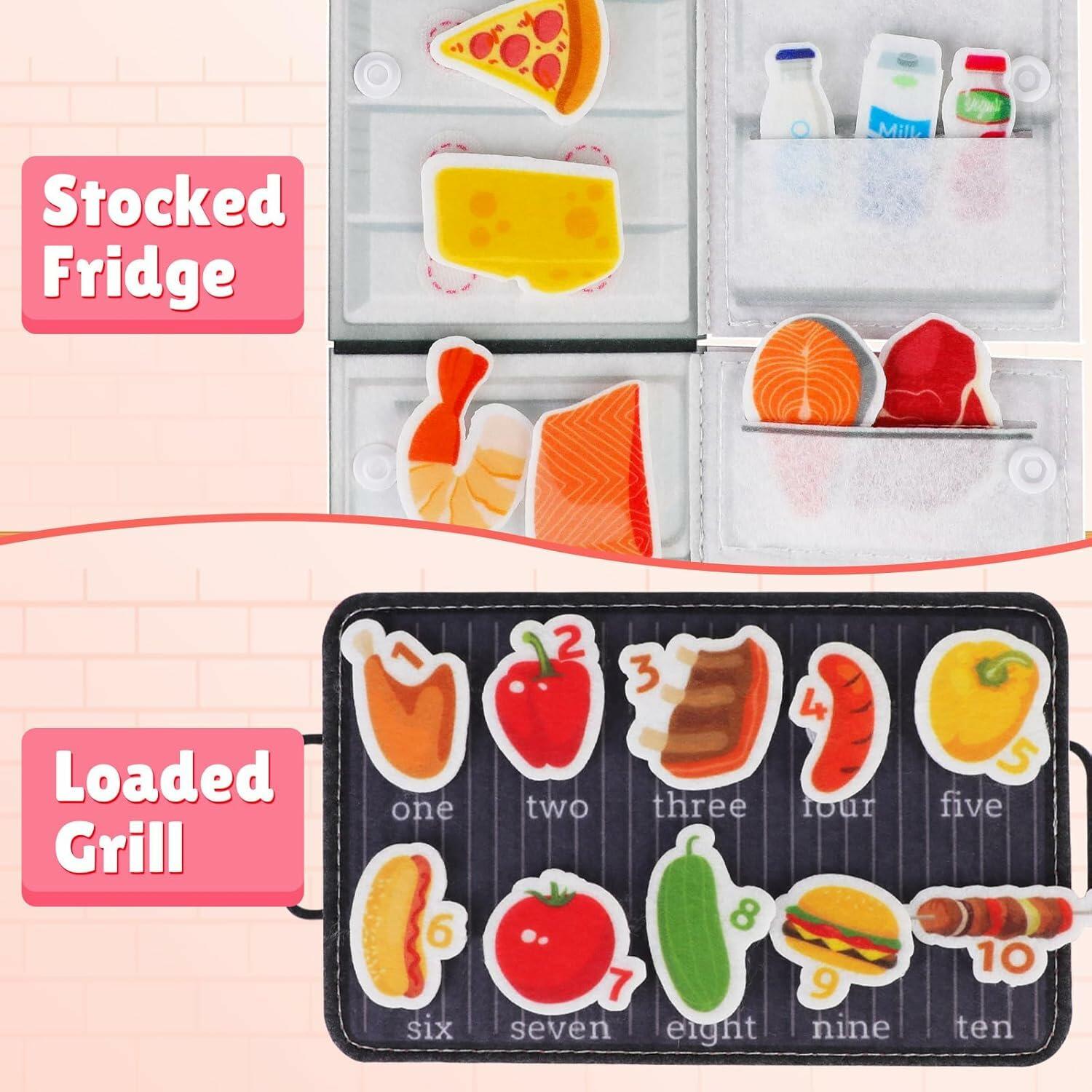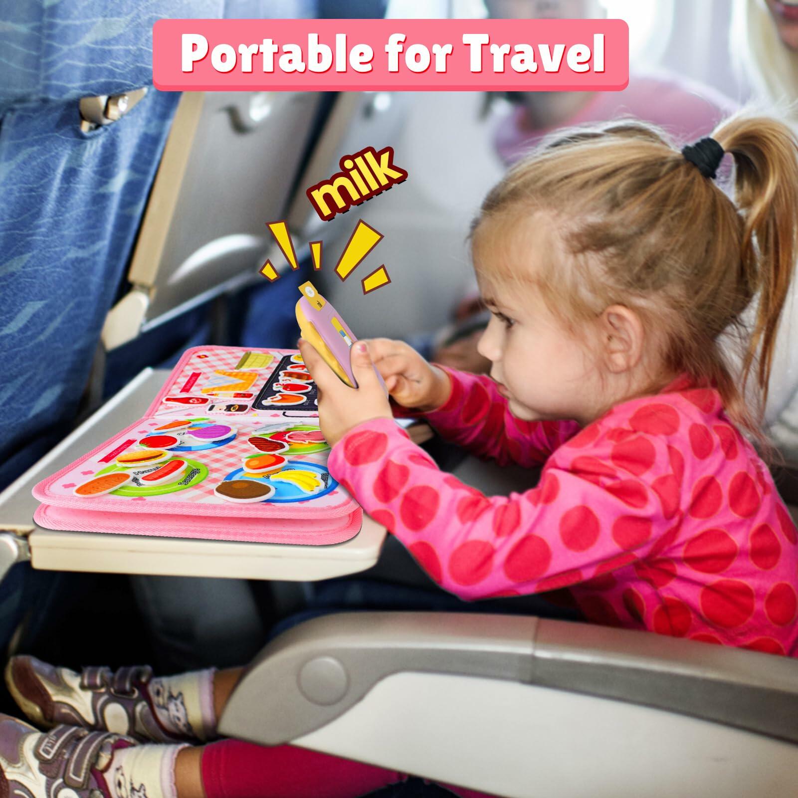 - COOKING BUSY BOOK - Give your kids the happy cooking experience with Quanquer Kitchen-themed Busy Board! From various kitchenware and food to BBQ activities, each activity is designed to develop basic skills in a fun, hands-on way. This pink kitchen busy book features 8 pages of engaging content and 18 activities that spark creativity while enhancing hand-eye coordination, logical thinking, and independent learning skills for toddlers aged 1 2 3 4