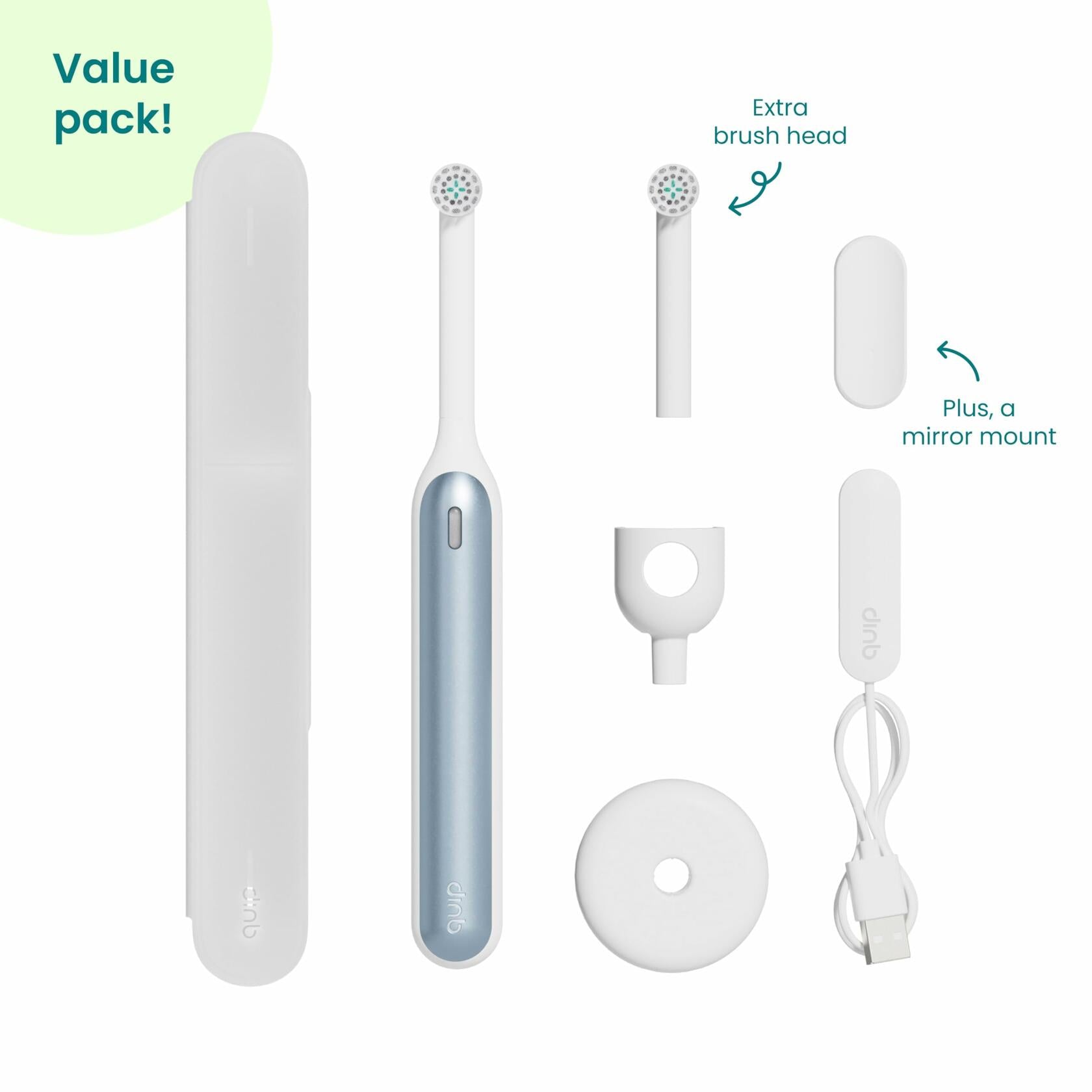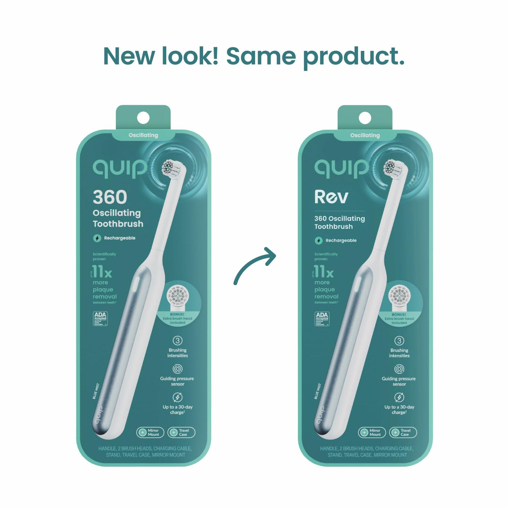 quip Rev revolves around your personal oral care needs with features that are loved by mouths, backed by science. Remove up to 11x more plaque from between teeth* with 2x more whitening** with 3 brushing intensities (gentle, daily, deep clean), a guiding pressure sensor that helps prevent harsh brushing (red light and pulses remind you to let the brush do the work), and a charge that lasts up to 30 days (when used on gentle, 2 min, 2x daily). The quip Rev replaceable soft-bristle brush head oscillates, rotates, and pulsates to help remove plaque along the gumline and between teeth, and is great for sensitive teeth and gums. Meticulously designed, yet boldly simple, the sleek, lightweight handle (metal detail) features a 2-minute timer with 30-second pulses for extra care and control, and comes with a magnetic charging cable (adapter not included), stand, travel case, plus mirror mount. To get the best clean, replace brush heads on the dentist-recommended schedule every 3 months before they are old, worn out, and ineffective. Do not use on children under age 3. Make a simple switch to the best electric toothbrush with quip Rev, accepted by the American Dental Association. * vs. a regular manual toothbrush, in vitro study ** by removing surface stains, vs. a regular manual toothbrush, in vitro study This product carries a 2-Year Limited Warranty that covers all manufacturing defects from the date of purchase and excludes normal wear and tear, product misuse/abuse, or lost items.