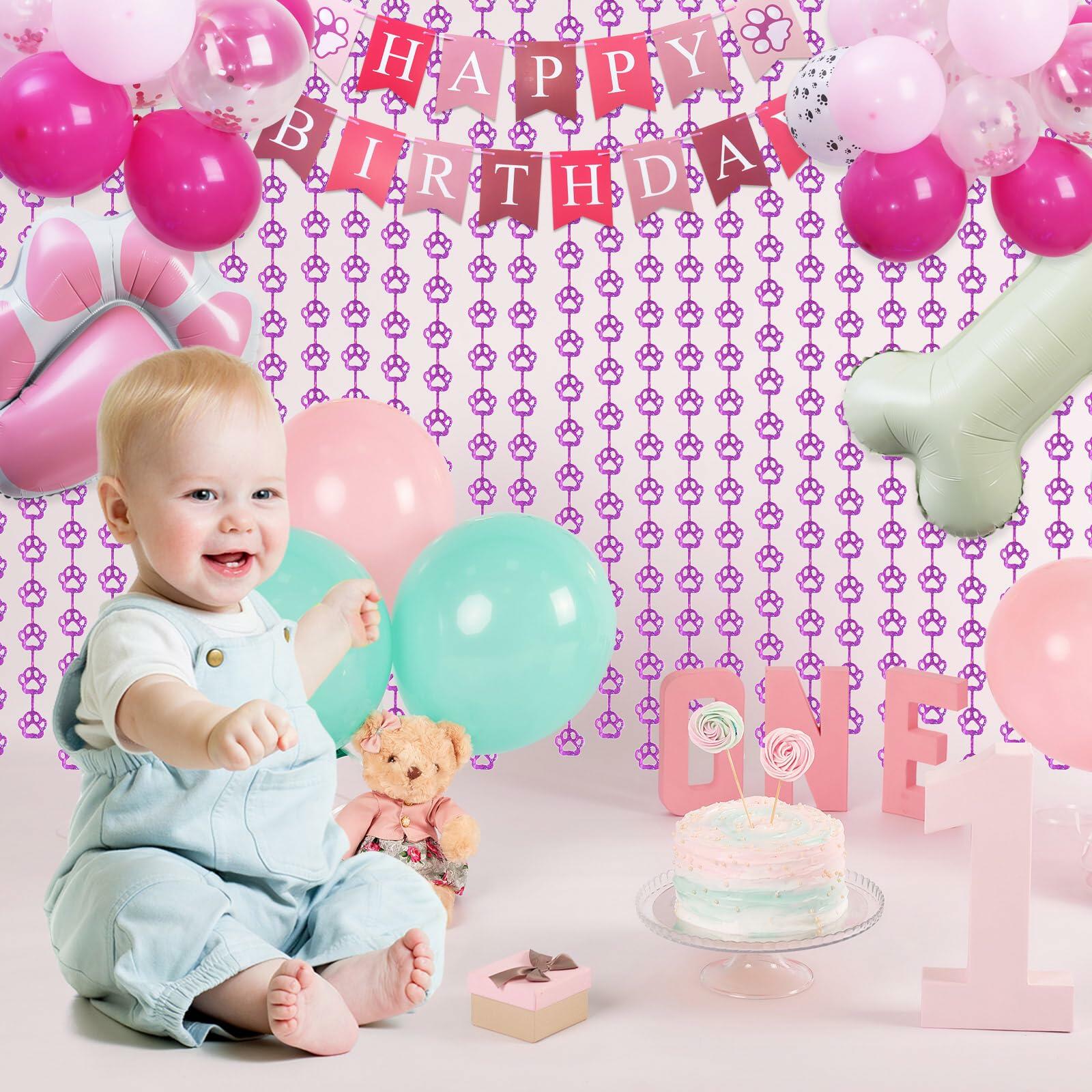 - 25Pcs Pink Dog Paw Birthday Decorations: The set includes 2Pcs 3.3x6.6 ft pink foil fringe curtains, 1 Set happy birthday banners, 1Pcs pink paw shaped aluminum foil balloons, 1Pcs white bone shaped aluminum foil balloons, 5Pcs white paw balloons, 5Pcs light pink balloons, 5Pcs dark pink balloons, 5Pcs white sequinsballoons
