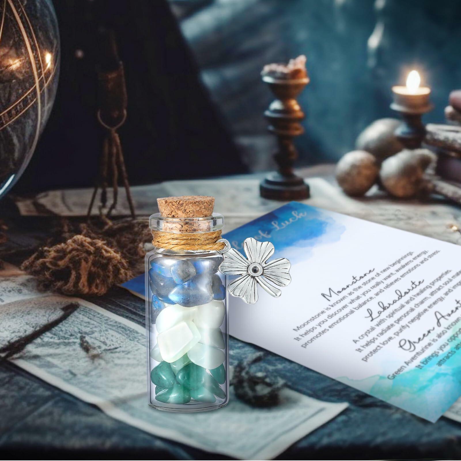 - Crystal Bottle Set: you will get a bottle of natural crystal stone including moonstone, labradorite and green aventurine, a crystal card introducing the functions of stones, a silver four-leaf clover to decorate on bottle mouth with a jute rope