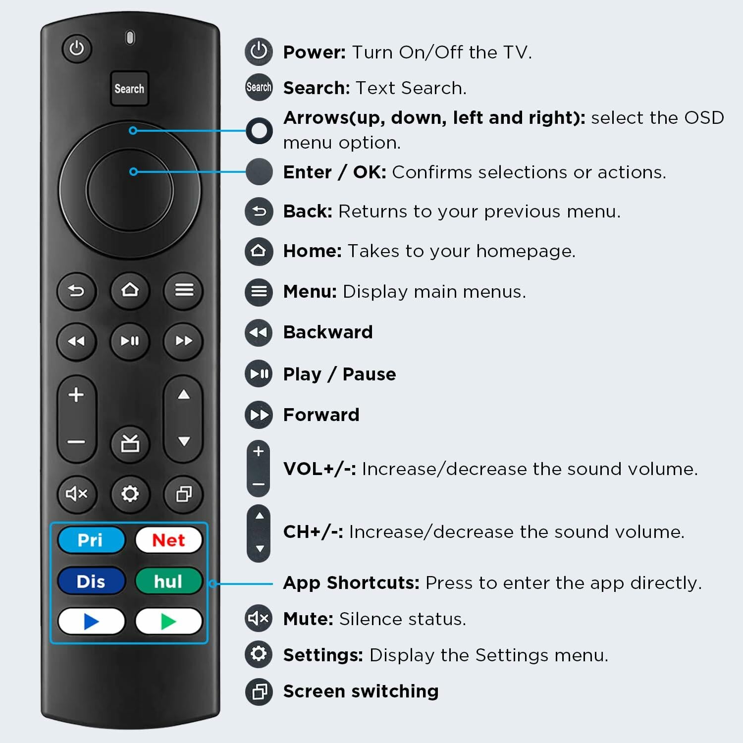 Upgrade your streaming experience with this versatile replacement remote control, specifically designed for AMZ TV edition smart TVs from Insignia, Toshiba, and Pioneer. This remote features dedicated shortcut buttons for popular streaming services including Prime, Netflix, Disney+, and Hulu, allowing quick access to your favorite content. The intuitive button layout includes a circular navigation pad, playback controls, and volume adjustment buttons for seamless operation. Compatible with various TV models including CT-95018, NS-RCFNA-21, and NS-RCFNA-19 series, this remote requires no programming or setup - simply start using it right out of the box. The ergonomic design fits comfortably in hand while providing easy access to all functions including Search, Settings, and Home menu options. Note: This remote is specifically designed for AMZ TV edition televisions and is not compatible with AMZ TV sticks or cube devices. Perfect for replacing lost or damaged original remotes while maintaining all the functionality you need for your smart TV experience.