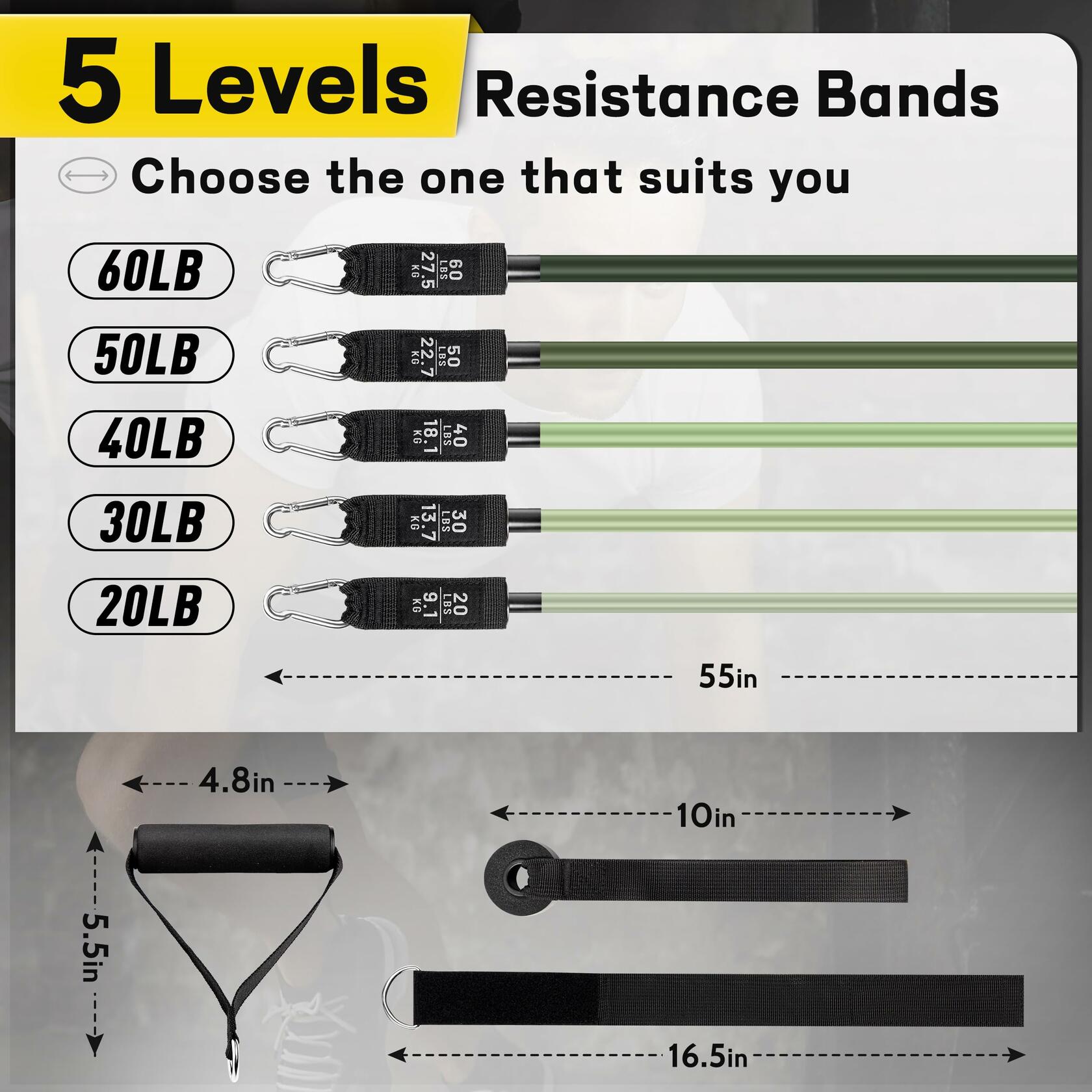 - Adjustable Resistance Bands, with a maximum equivalent of 200 lbs: including 5 55-inch long color-coded bands: (20 lbs), (30 lbs), (40 lbs), (50 lbs), (60 lbs). You can use these bands individually or combine them in any way you like, with a maximum resistance level of 200 lbs.