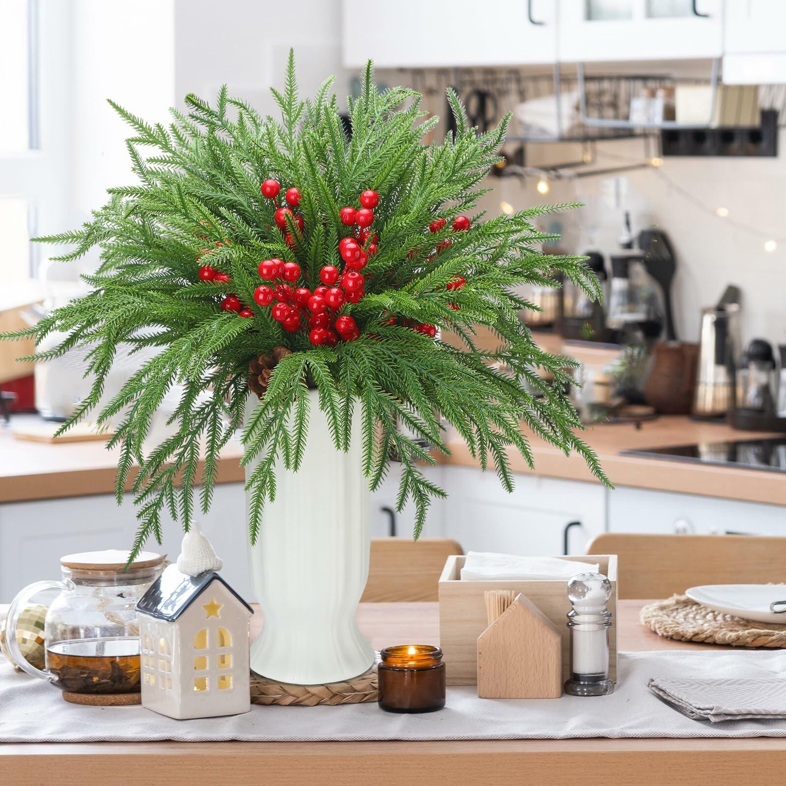 - Christmas Decorations: create a festive atmosphere with our artificial Christmas Norfolk pine stems; The natural green color complements traditional Christmas decorations, and the layers of branches and leaves on the stems make the whole bouquet look very layered; Full of Christmas atmosphere; Create a warm and cozy atmosphere for your home; This is a must-have for holiday decorations and can really turn your home into a picturesque Christmas place