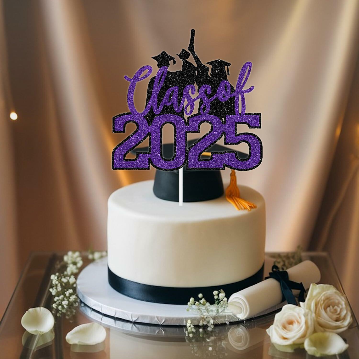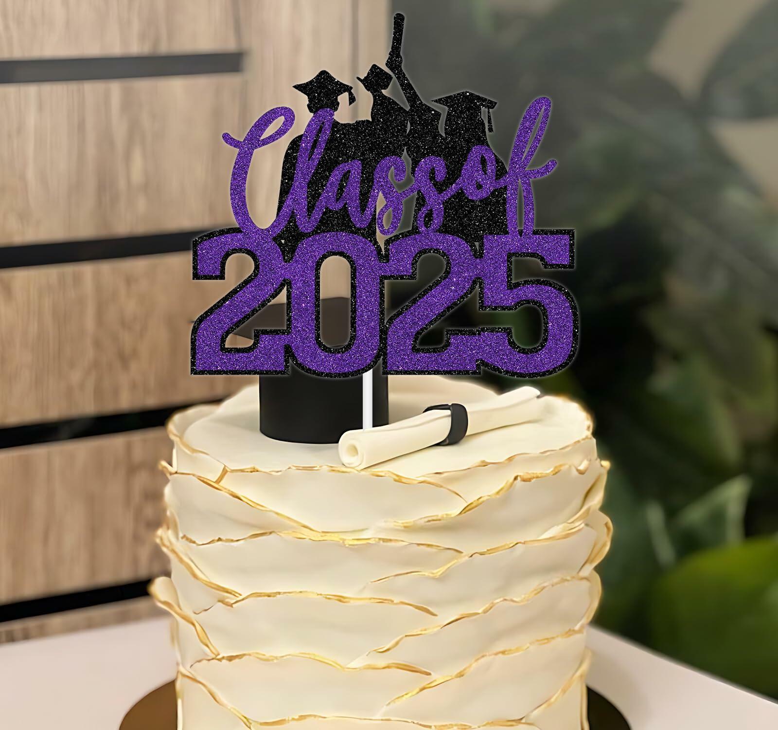 RLXPT Class of 2025 Cake Topper Congrats Grad Black Purple Glitter Foil