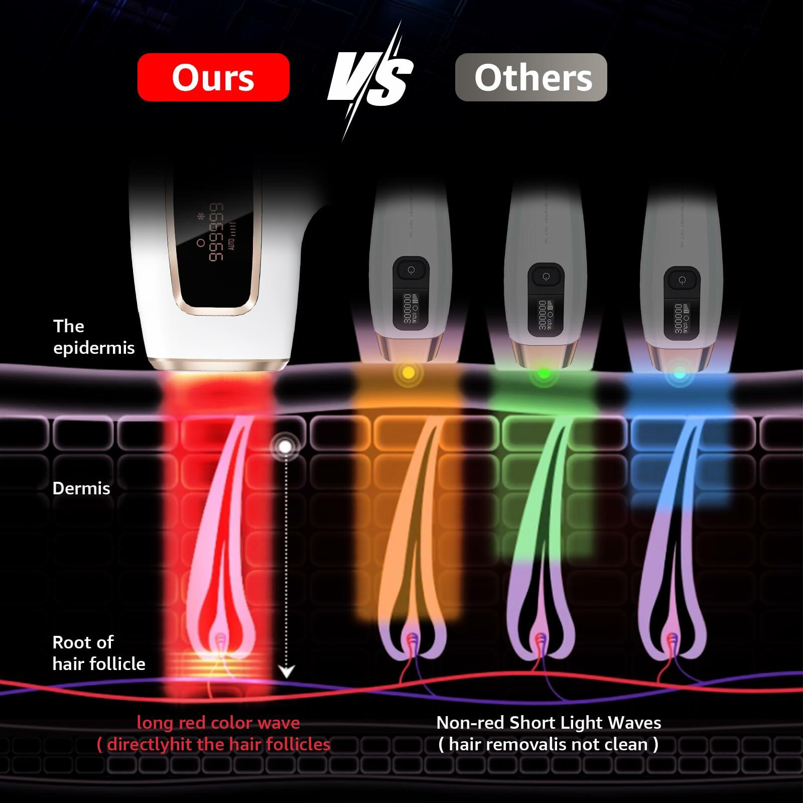 - 【Upgraded Painless Care】The light hair removal devices for women with painless care features, it can cool the skin while emitting pulsed light. Skin temperature as low as 6℃,soothes the burning sensation and won't cause skin redness.Making the hair removal treatments painless and Skin-Friendly.
