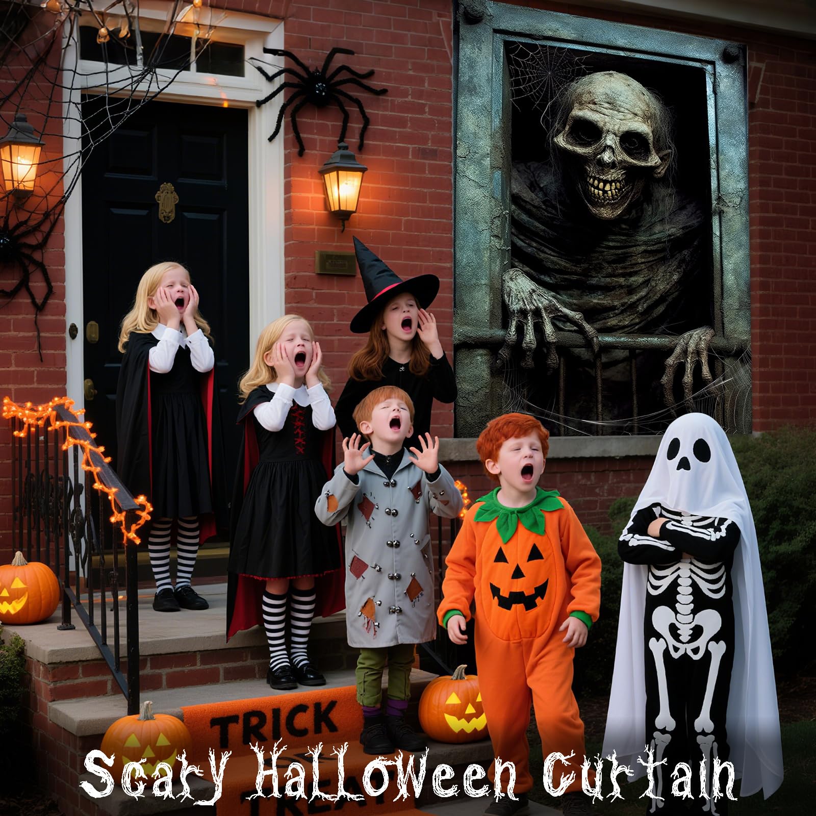 - Versatile decoration: Halloween curtains are suitable for living room and bedroom windows, making your room full of horror scenes. They can also be used for front door decoration, garage door decoration, Halloween haunted house decoration, living room wall decoration, party background, classroom activity decoration, bar decoration, photo background, etc. This scary decorative prop can add a spooky atmosphere to any place. Suitable for Halloween theme parties and haunted house theme event decor