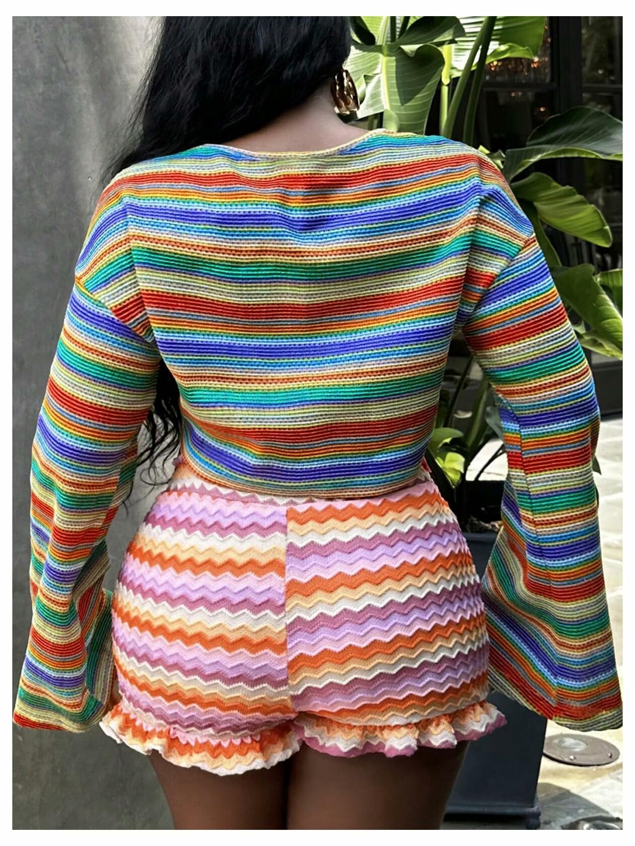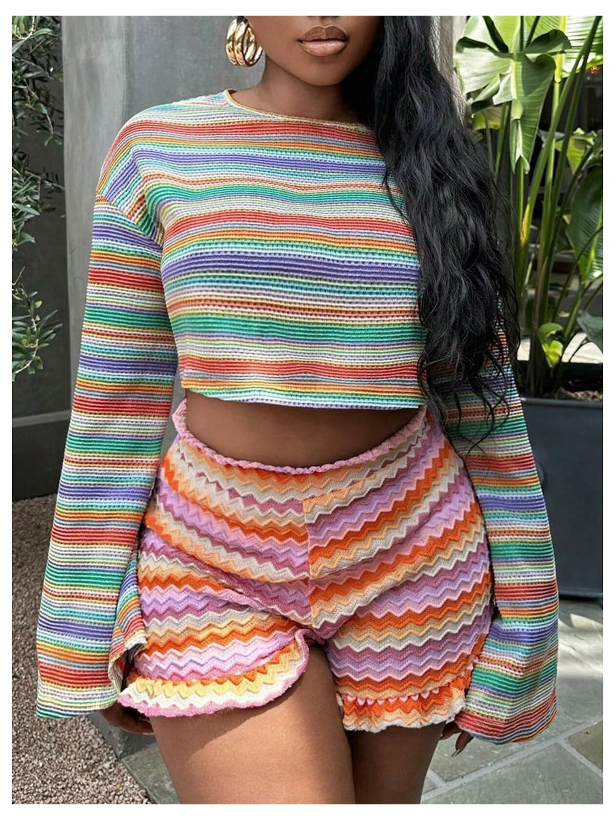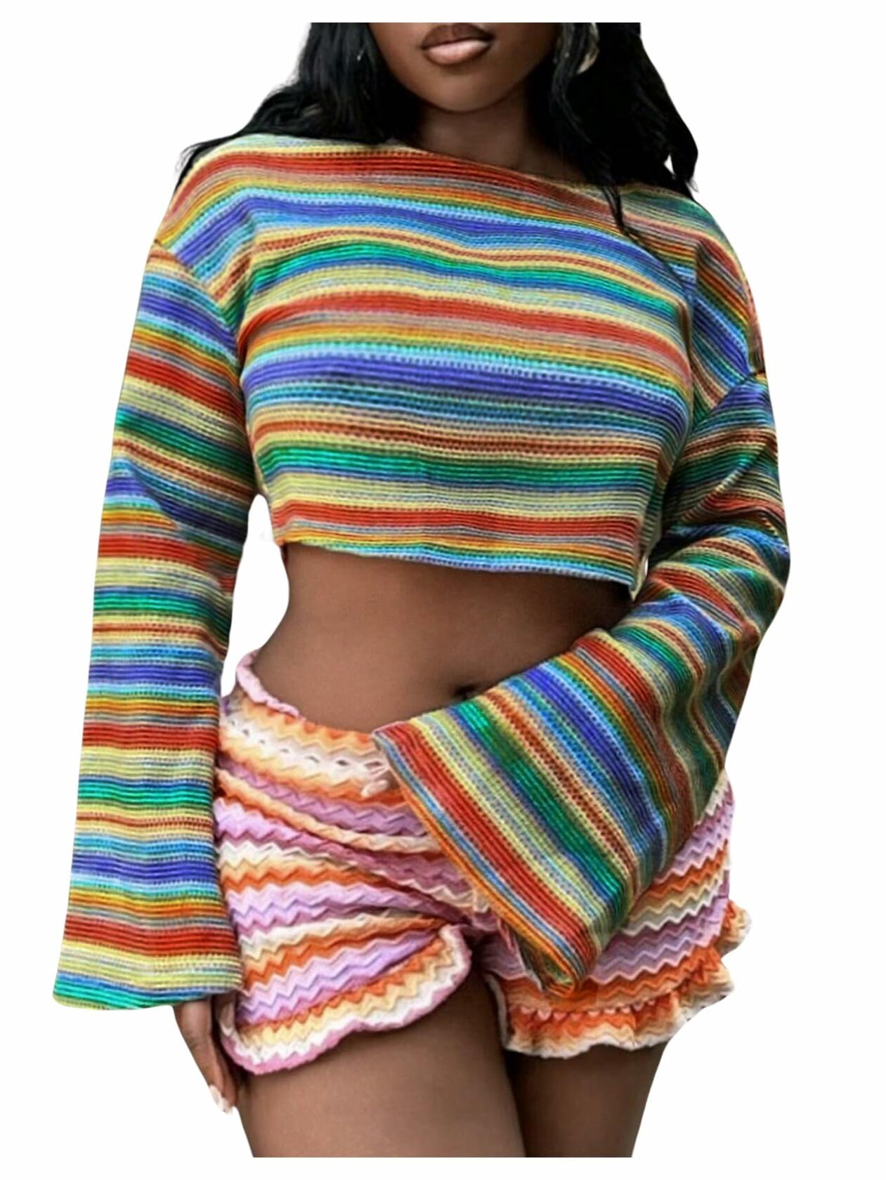 RoseSeek Women's Striped Crop Top Long Sleeve Knit Tee Multicolor Size S
