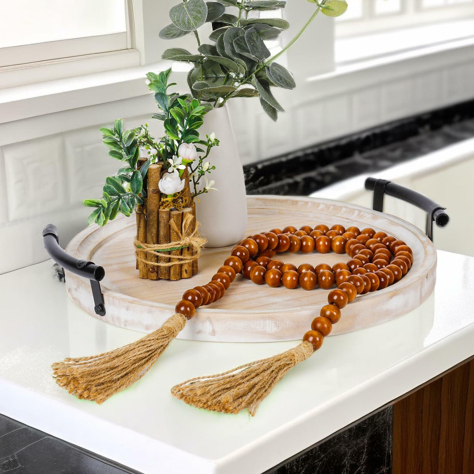 Round Wood Tray with Wood Bead Garland 13" Decorative Tray with Handles