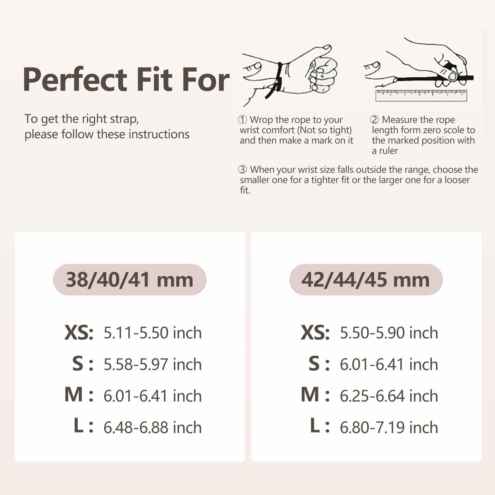 - 【38/40/41/Series 10(42mm) XS : 5.11"-5.50" wrist】 【38/40/41/Series 10(42mm) S : 5.58"-5.97" wrist】 【38/40/41/Series 10(42mm) M : 6.01"-6.41" wrist】 【38/40/41/Series 10(42mm) L : 6.48"-6.88" wrist】 【42/44/45/49/Series 10(46mm) XS : 5.50"-5.90" wrist】 【42/44/45/49/Series 10(46mm) S : 6.01"-6.41" wrist】 【42/44/45/49/Series 10(46mm) M : 6.25"-6.64" wrist】 【42/44/45/49/Series 10(46mm) L : 6.80"-7.19" wrist】 Note: Please select the size that ensures a com:table fit : your Apple Watch