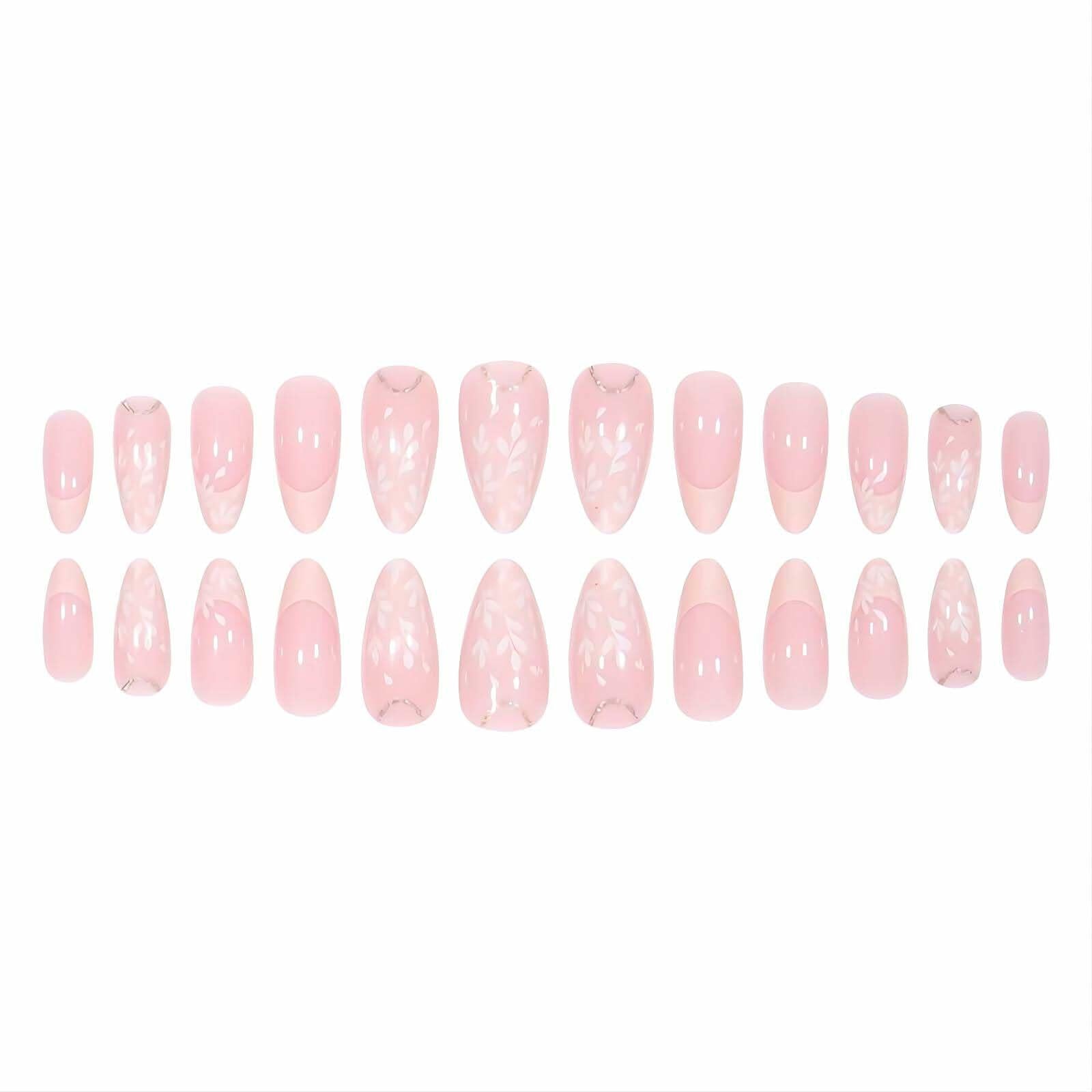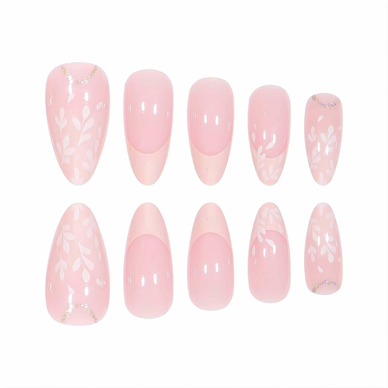 RUOKEXIN Pink Press On Nails Medium Almond French White Tip Glitter Leaves