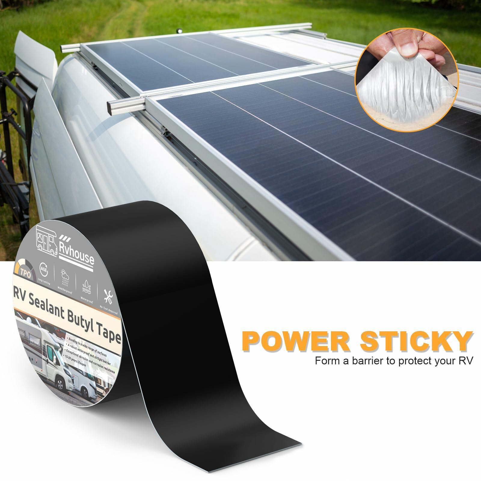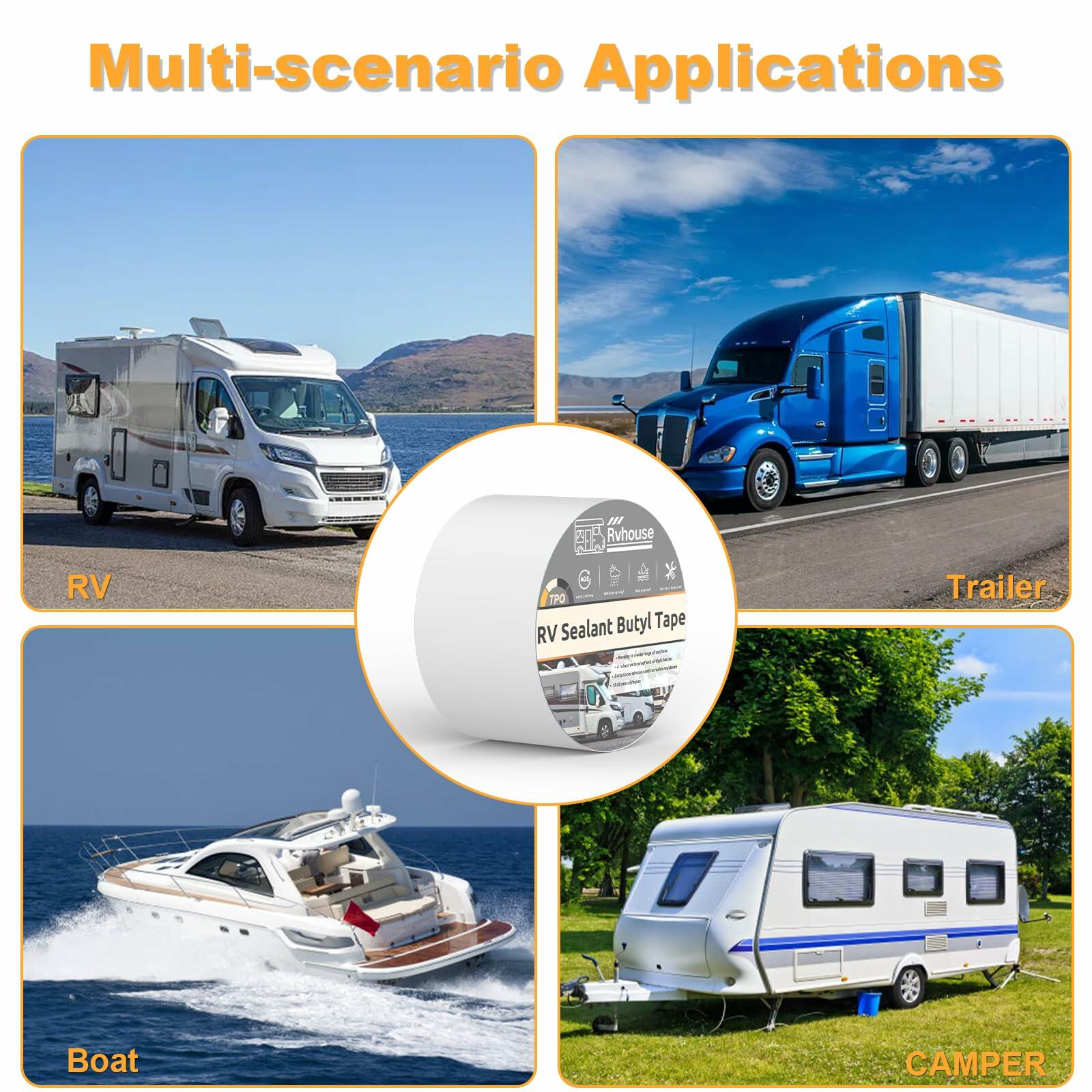 - WIDE APPLICATION: Rvhouse RV roof tape bonds securely to a variety of materials including EPDM, Hypalon, TPO, aluminum, galvanized steel, wood and fiberglass. This tape provides a strong, durable seal on a variety of surfaces and is ideal for a variety of applications such as RV roofs, trailer sides, boats and more. An excellent solution for a variety of different maintenance needs to ensure surfaces are reliably protected, especially for RV maintenance.