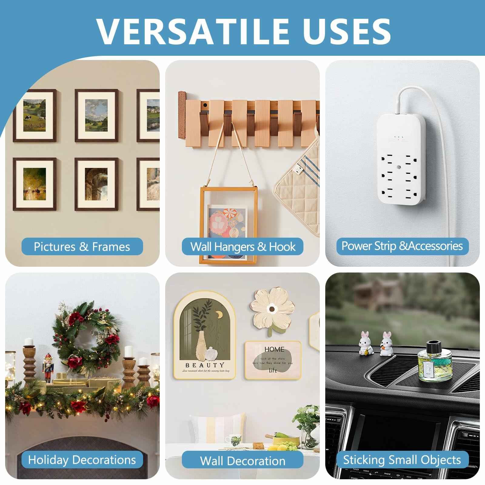- [Widely Use]: Double sided tape has strong adhesion,suitable for installing photo frames,posters,tables,sockets,cabinet lights,fixing car perfume,dIY items,etc.Make your life cleaner and more comfortable.