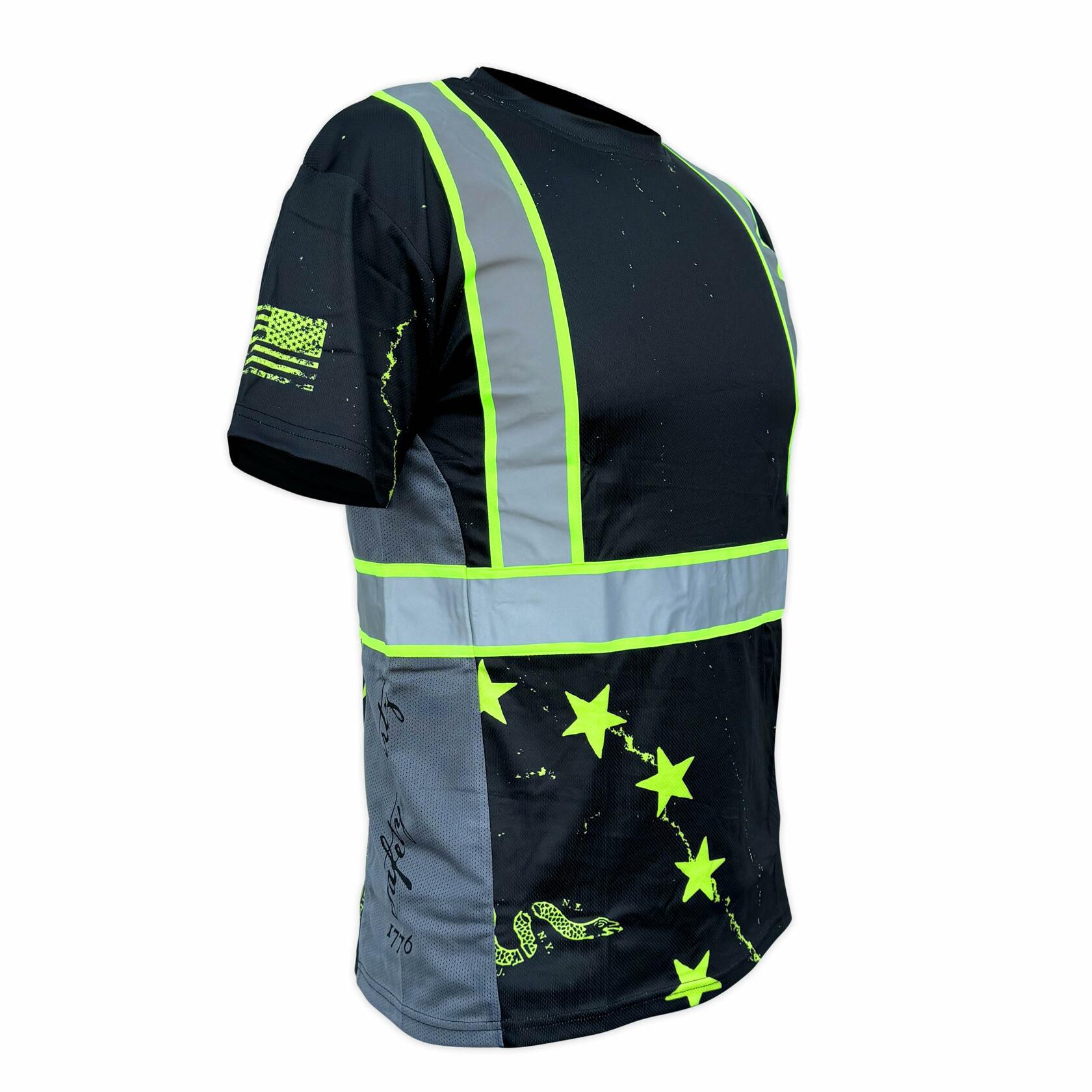 - PATRIOTIC TEE SHIRT: Stand out on the job site and showcase your patriotism in hi-vis with our black 1776 Betsy Ross Flag SafetyShirtz tee, a hard working hi vis shirt for hard working people.