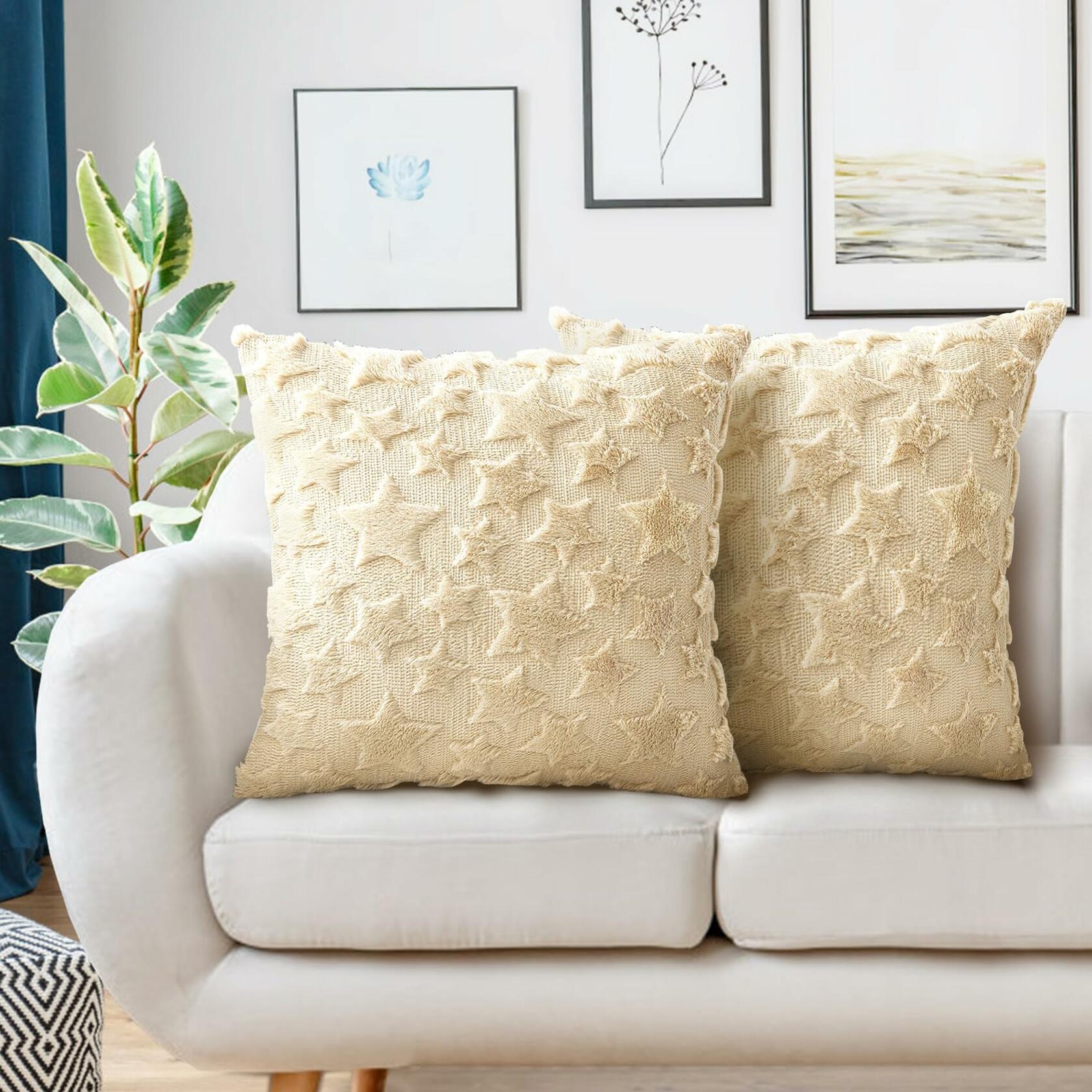 - 【Soft and Luxury Fabric】Our christmas square throw pillow covers 18x18 inch/ 45x45cm set of 2 are made of soft plush short wool (polyester) front with 3D embossed star pattern and velvet back. Our pillow cover will lighten up your sofa, couch ,bed, chair in living room in winter holiday season. A soft and comfortable cream beige throw pillow covers set that’s easy to mix and match with other decor.