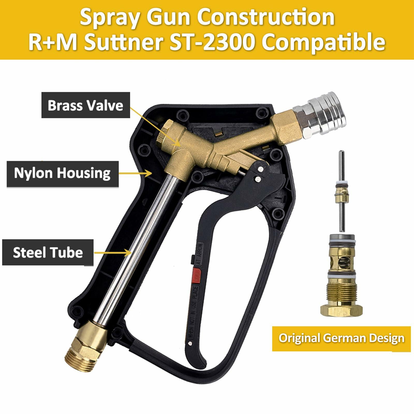 - Package Contents: Spray Gun, Inlet - M22 Male Swivel -14Mmm, Outlet - 1/4” Quick Connector Coupler, Max Pressure 4500 PSI, Max Temperature 300 °F, Max flow 40 lpm / 10.5 gpm. Compatible with R+M Suttner ST-2300.