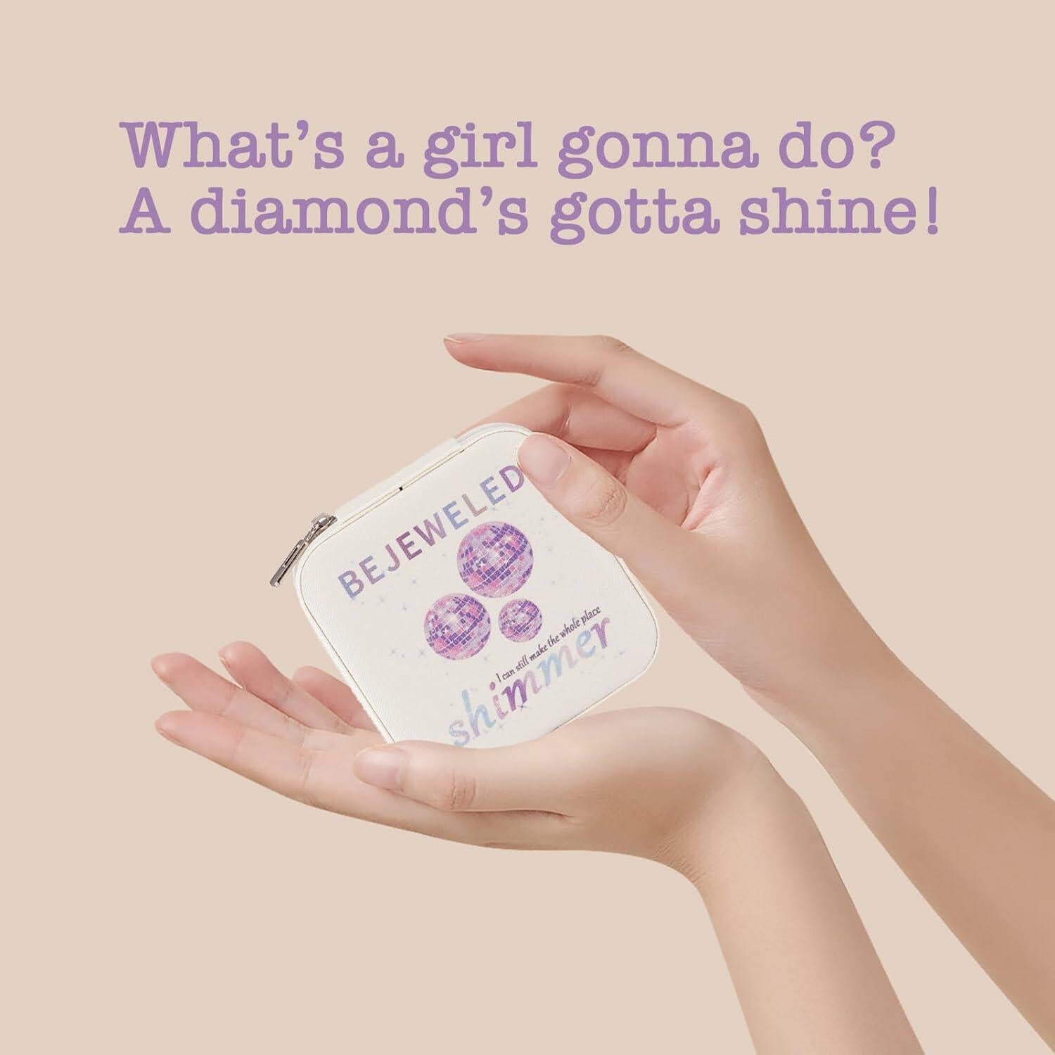 - Our small jewelry storage box features the words 'bejeweled', complemented by three mesmerizing disco balls that echo the song 'Mirrorball.' This design beautifully encapsulates the singer's musical inspiration, making it an ideal gift for fan.