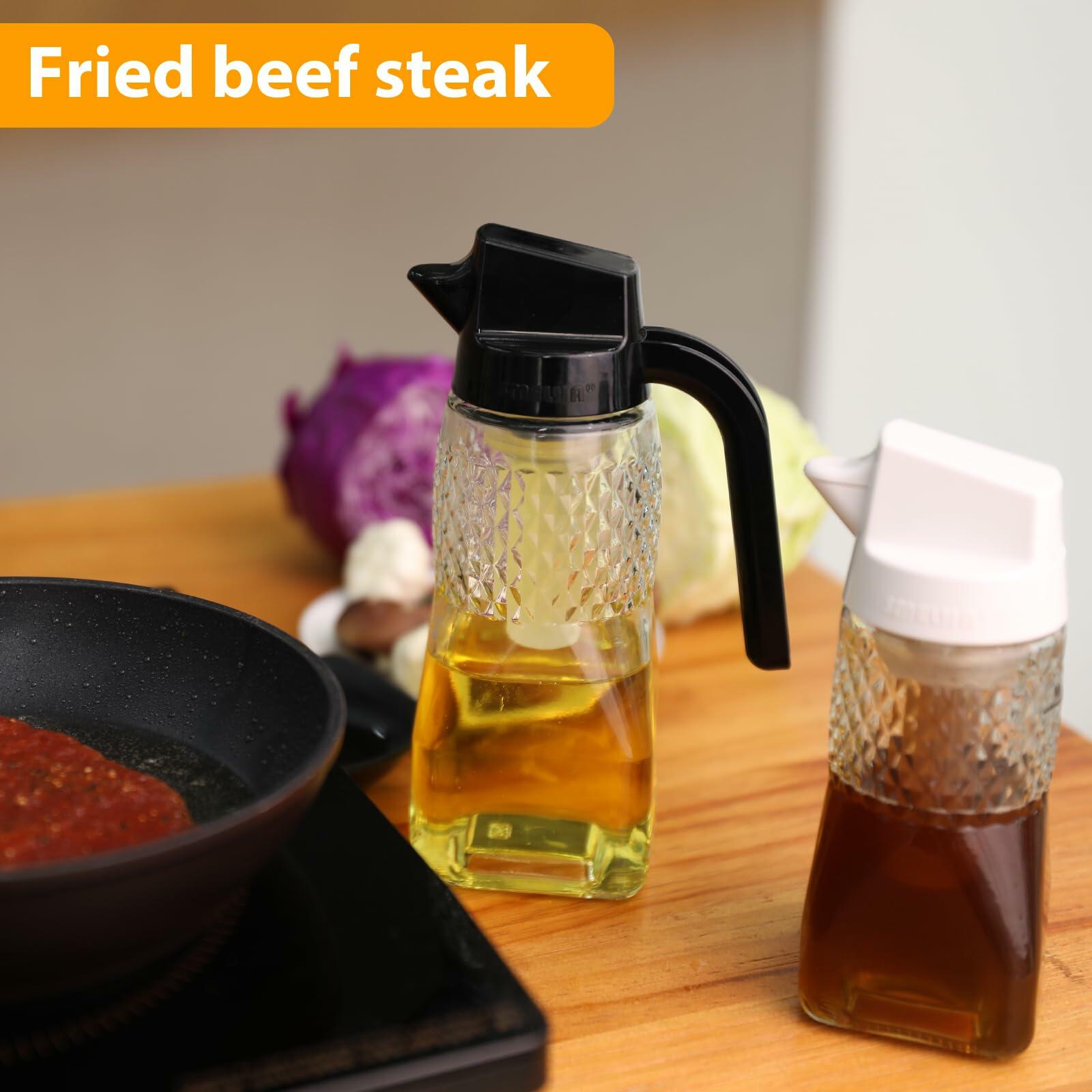 - 【Automatic Lid Flip Design】:When you pick up the oil bottle to pour the oil, the lid will automatically open under the action of gravity, put back into the oil bottle, the lid will automatically close, and you can operate with one hand, without manually switching the lid, clean and dustproof.