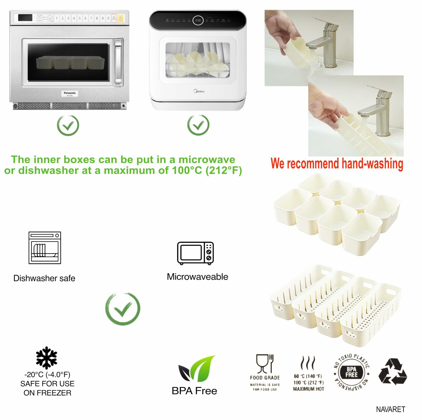 - Friendly reminders : Transparent Box and Lid are made in PET therefore CANNOT BE MICROWAVED or DISHWASHED. Tolerated temperature is -20 °C to 60 °C. The 8 or 4 inner compartments are made in PP, so they can be put in the MICROWAVED for 3 minutes or in the top rack of the DISHWASHED. Tolerated temperature is 100°C.