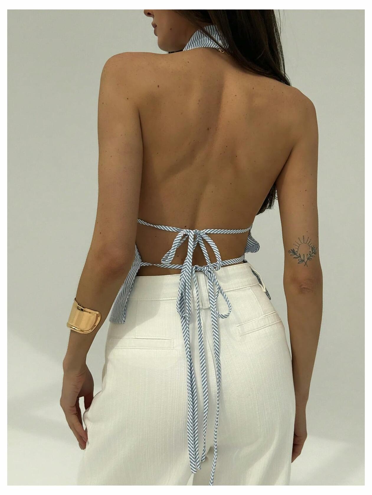 SOLY HUX Women's Striped Deep V Neck Bow Tie Backless Halter Top Blue Size S