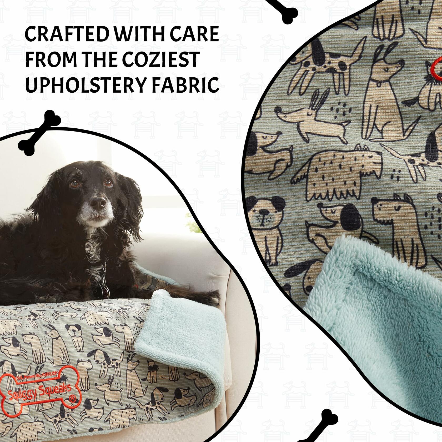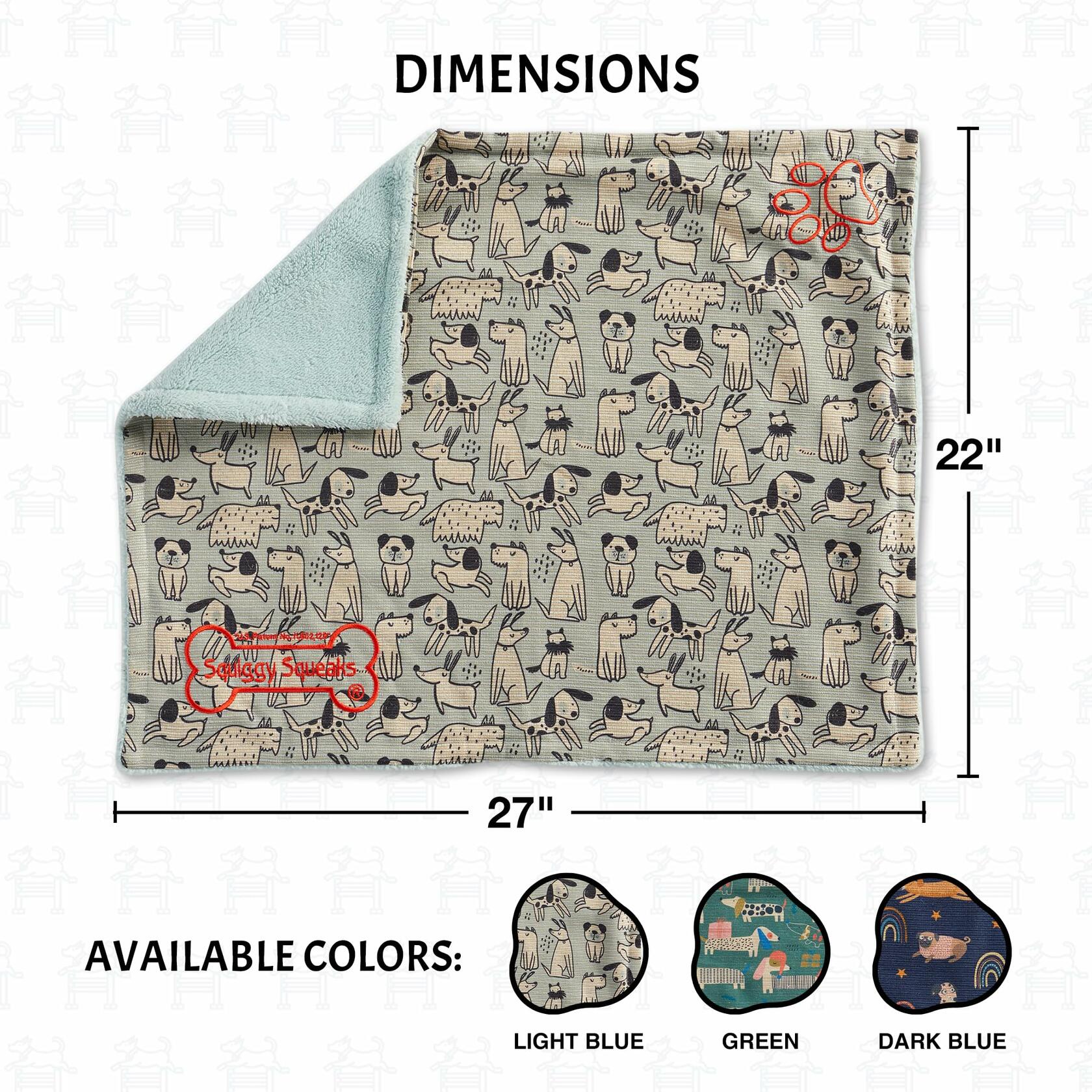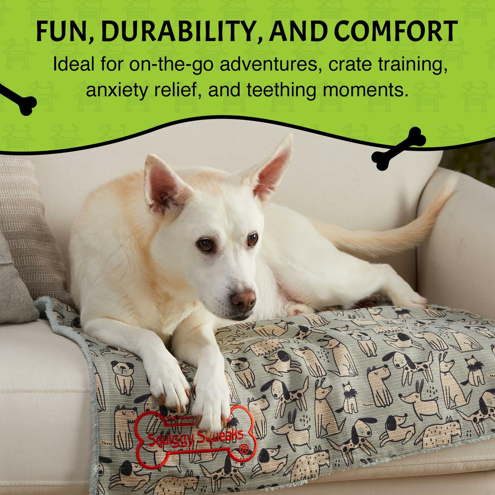 - SLEEP & PLAY BLANKETS IN ONE: Wrap your pet in pure comfort with Squiggy Squeaks Sleep and Play Dog Blanket – the ultimate snuggle companion. Crafted from the coziest upholstery fabric. But the excitement doesn't end there! Inside the blanket is a delightful surprise – a squeaker toy and a crinkle toy tucked into a water-resistant pouch.