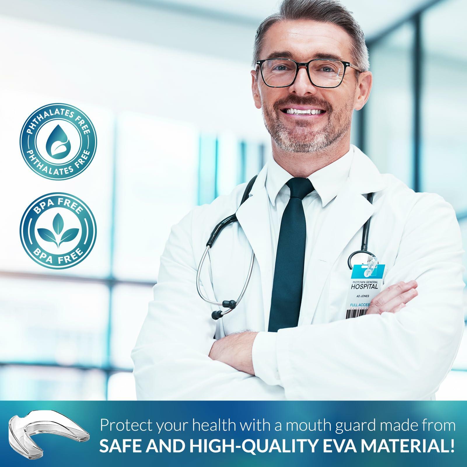 - PREMIUM MATERIAL FOR SAFETY: Crafted from high-quality material, our mouth guard for grinding teeth at night is safe and durable. Designed for long-term use, they include a protective case to keep them clean and secure.