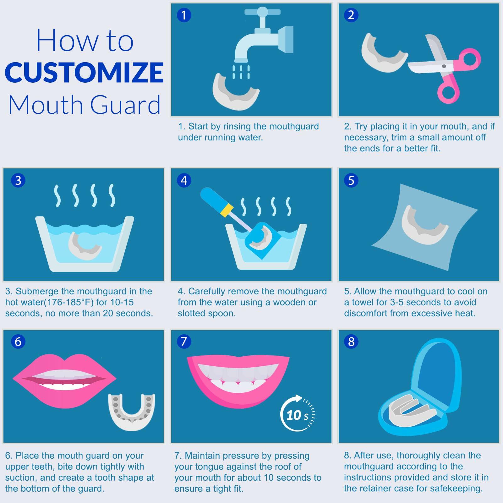 - EASY TO USE: Clear, step-by-step instructions are provided for easy molding and use of the mouth guard for grinding teeth at night. It’s important to follow these directions carefully for optimal results. We are confident that using our mouth guard for clenching teeth at night will improve your sleep quality, leading to a more refreshed and energized day.