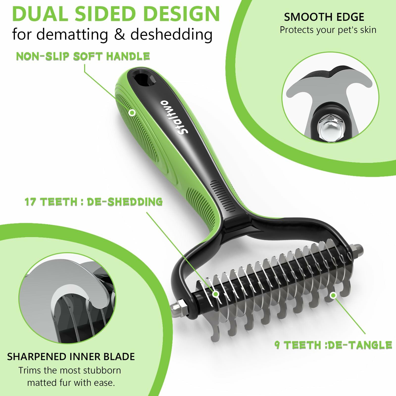 - Dual-Sided Design: Start with 9 teeth side for stubborn mats and tangles and finish with 17 teeth side for thinning and deshedding. Achieve faster and more professional dematting and grooming results