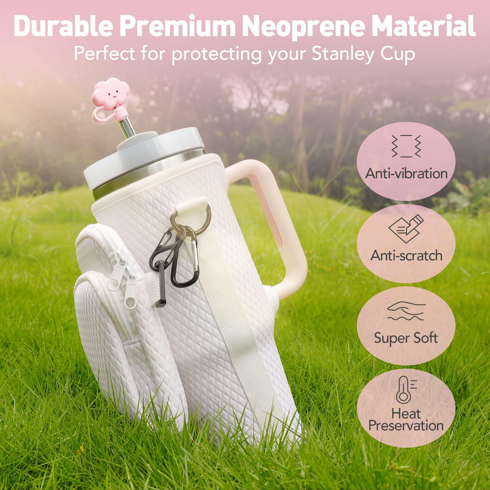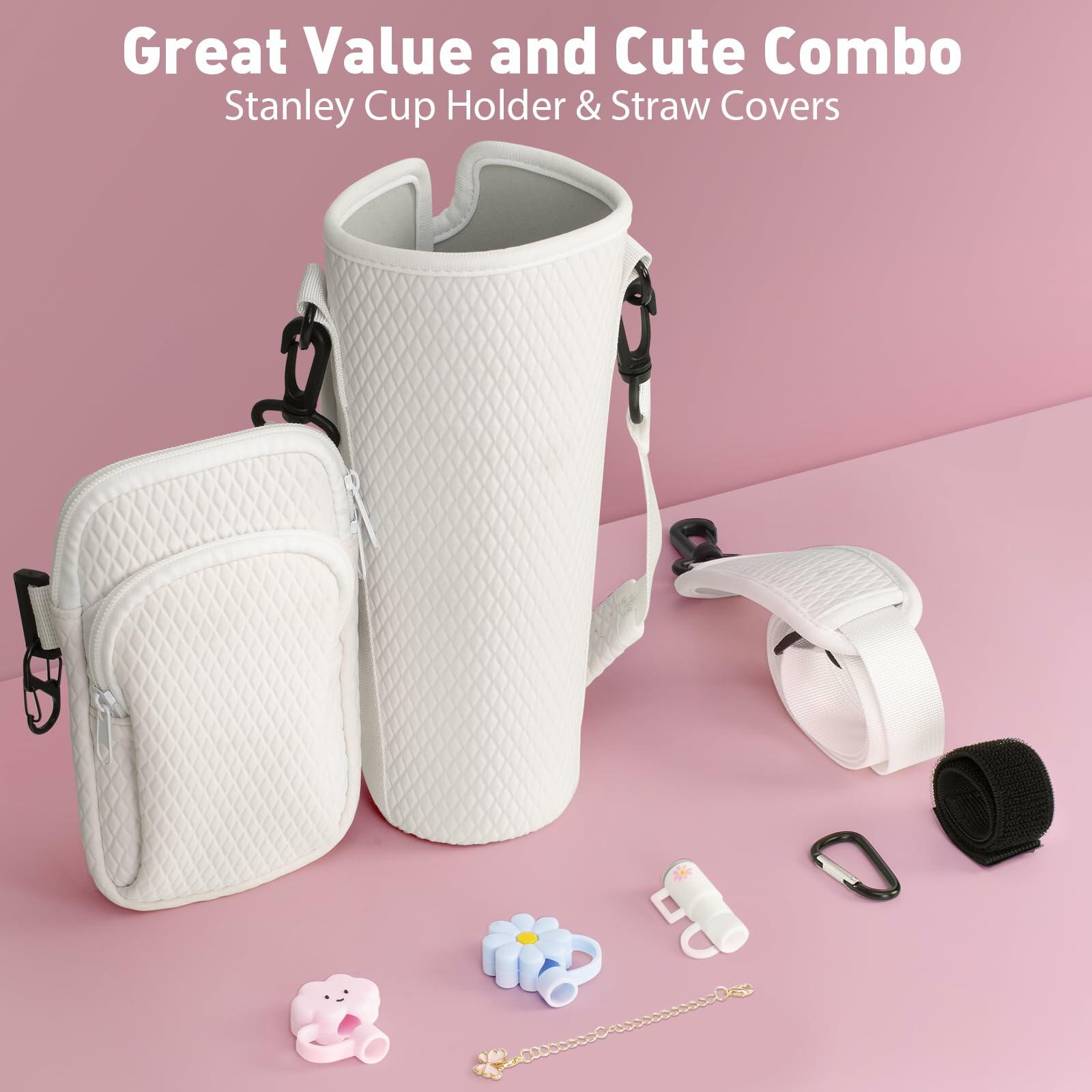 Introducing our ultimate stanley cup accessories Kit, combining style, functionality, and durability in one comprehensive package. This stanley cup holder with strap includes a chic cup sleeve with three adorable stanley straw cover straw toppers, offering not only eye-catching designs but also thoughtful features like built-in protective layers and dual front pockets for easy storage of essentials. The metal fasteners enhance the overall quality while the included metal carabiner adds outdoor versatility. Crafted from food-grade silicone, the stanley straw cover straw toppers ensure both safety and aesthetics. Plus, the adjustable shoulder straps, reinforced stitching, and high-quality neoprene material provide unmatched comfort, durability, and protection for your Stanley cup. Whether you're hiking, hitting the gym, or simply enjoying a stroll, this stanley cup holder with strap is the perfect companion for any adventure. With a range of trendy colors to choose from, it's also an ideal gift for Stanley fans and outdoor enthusiasts alike, making every occasion a memorable one(White).