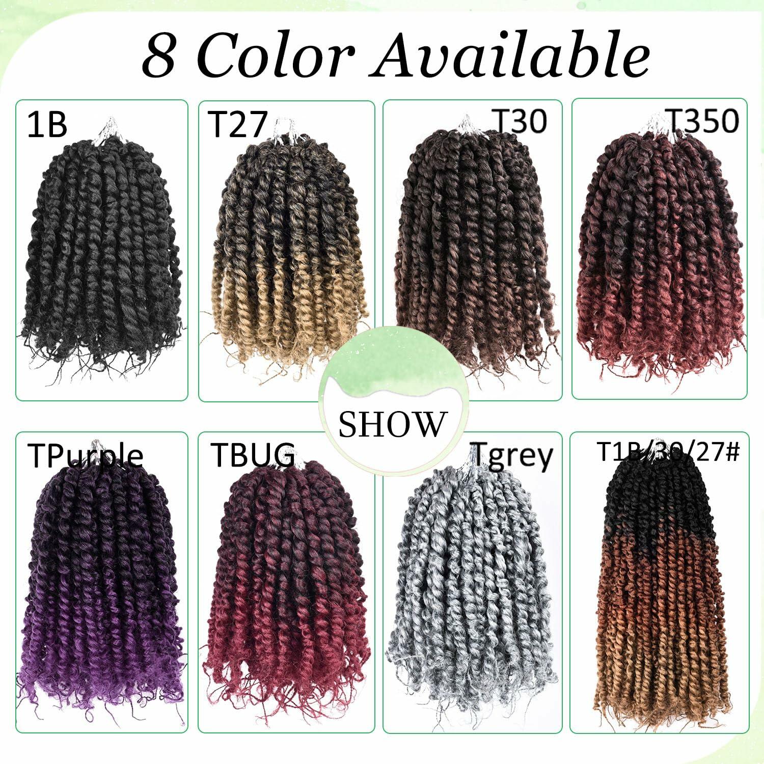 - Hair Specification: Crochet Pre-twisted Passion Twist Hair is 6 Inch short Bob Length; 8 packs/Package; Weight: about 25g/pack; 12Strands/pack; 96 strands In Total; Usually 8 Packs Can Full a Head; 1B#, T27#, T30, TBUG#, T350#, M/Grey# Colors Available; Comes with a crochet hair hook.