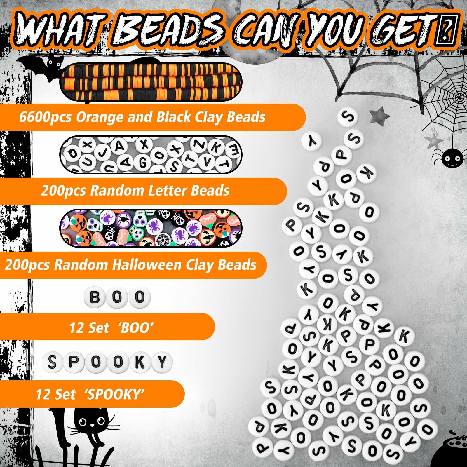 - Comprehensive Kit Featuring: this Halloween bracelet making kit includes 16 orange black clay strings 2 orange 2 black clay strings, 200 random letter beads, and 12 sets each of "BOO" and "SPOOKY" letter beads; With 200 random clay beads and a 15m elastic rope, you're equipped to craft personalized pieces that echo the spirit of the season