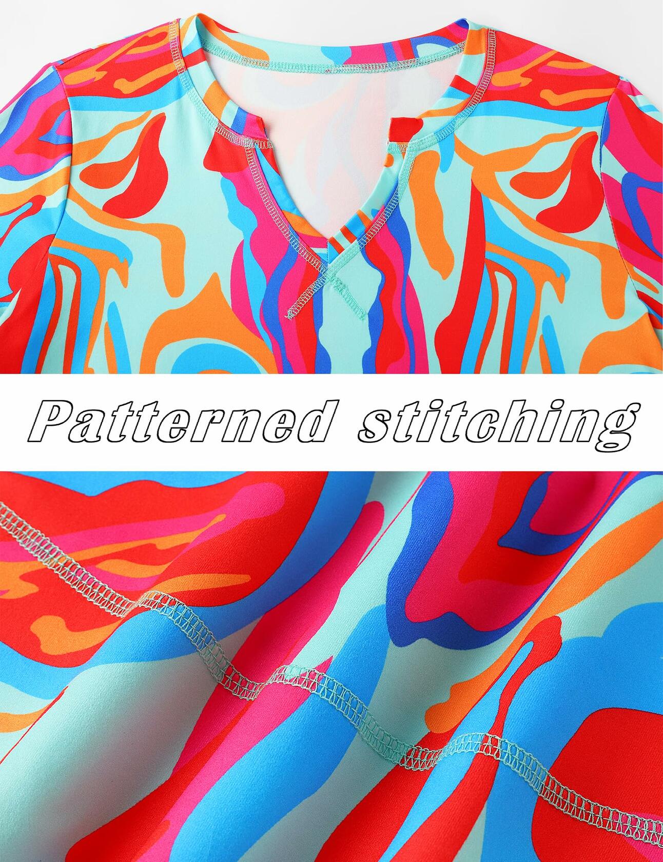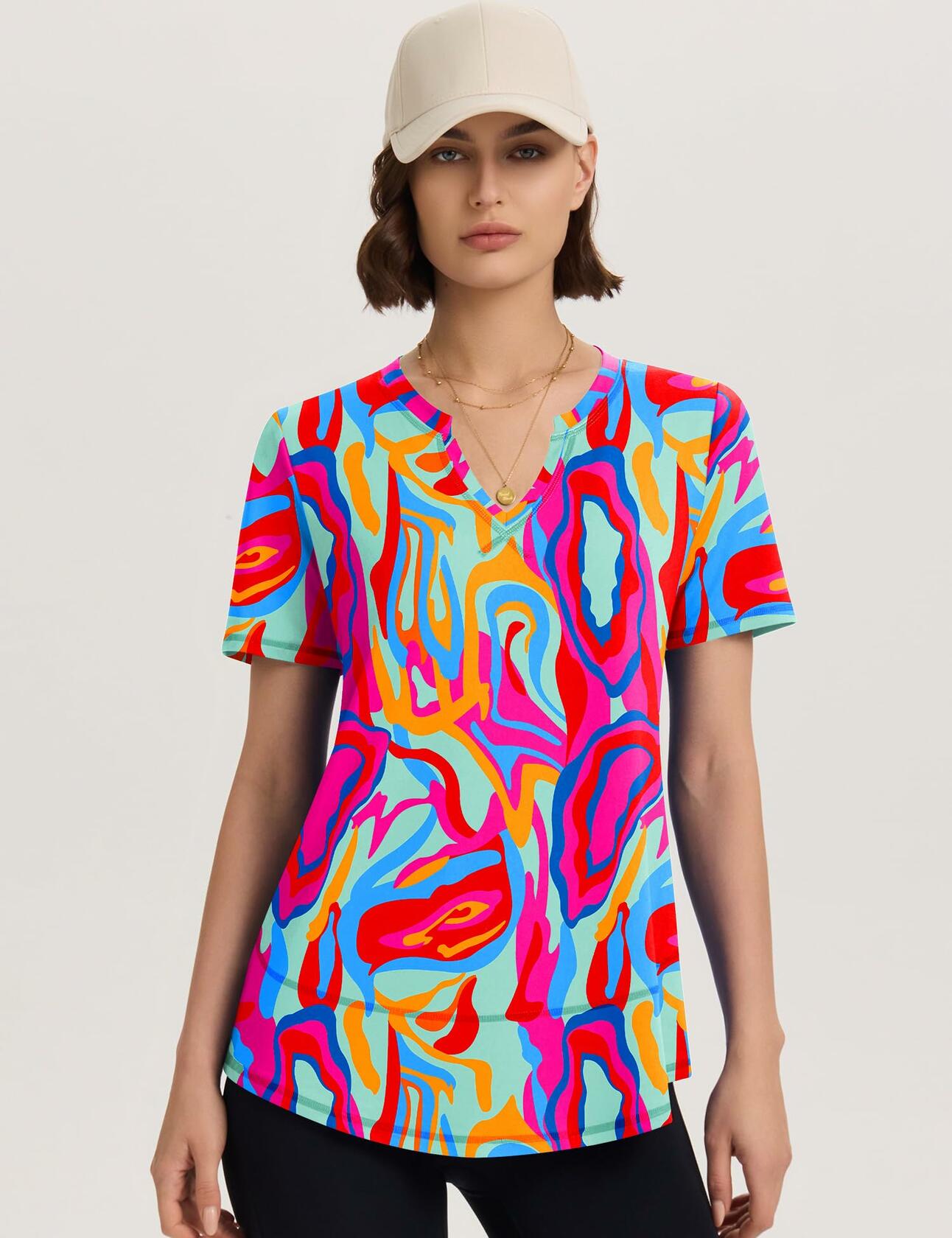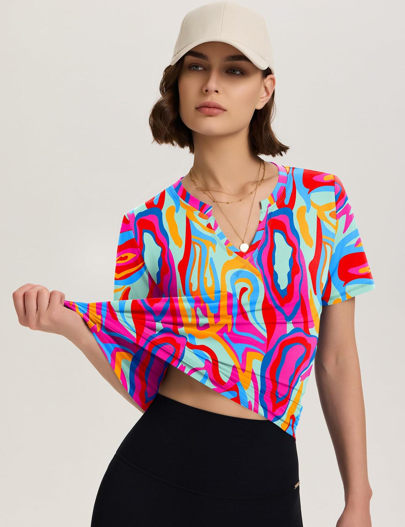 - Patterned stitching of the tops add attractiveness of the athletic tee shirt. Classic notch v neck design with curved hem, loose fitting shirt, with a nice stretch and falls nicely, easy to move without restriction, a great addition to summer workout clothes.