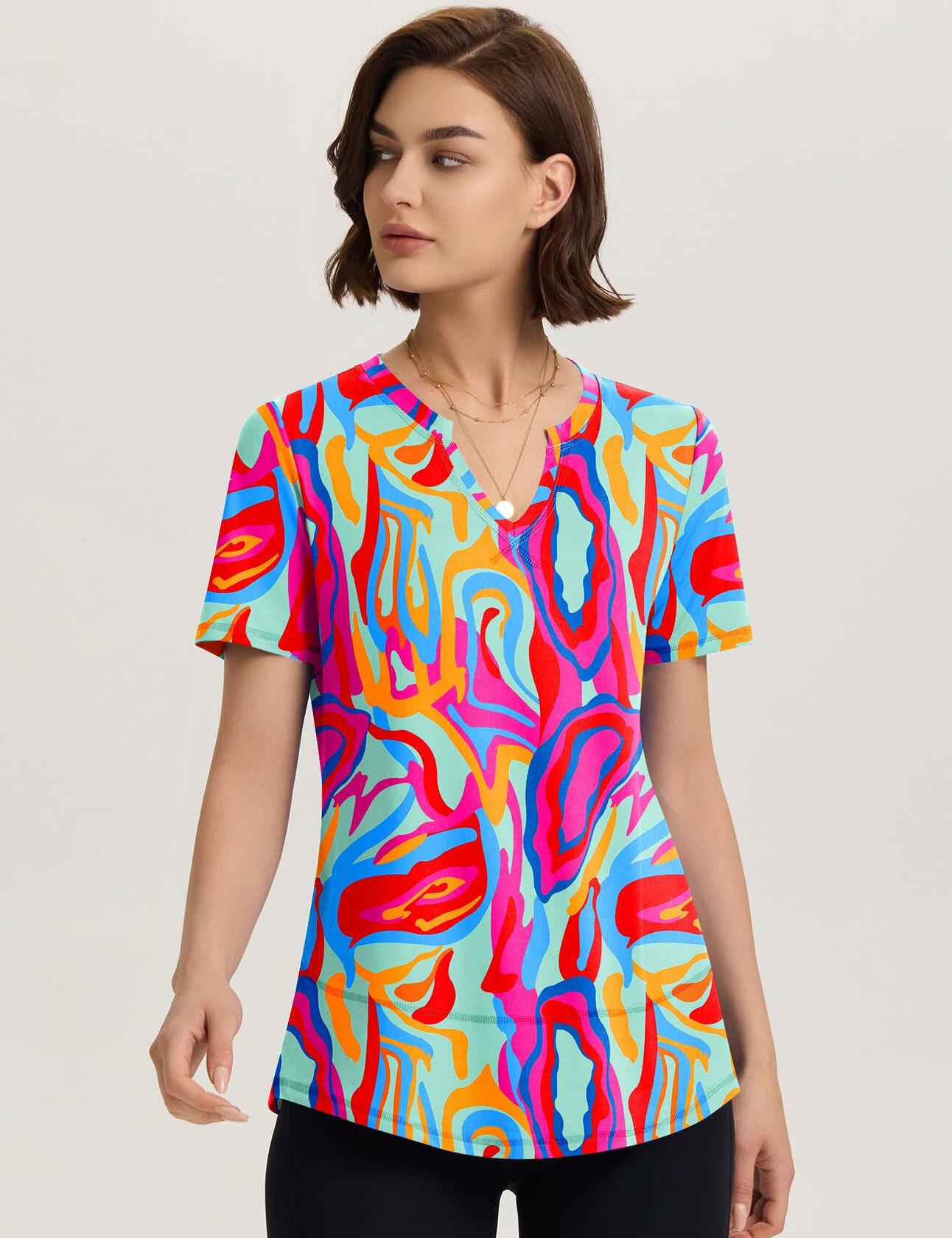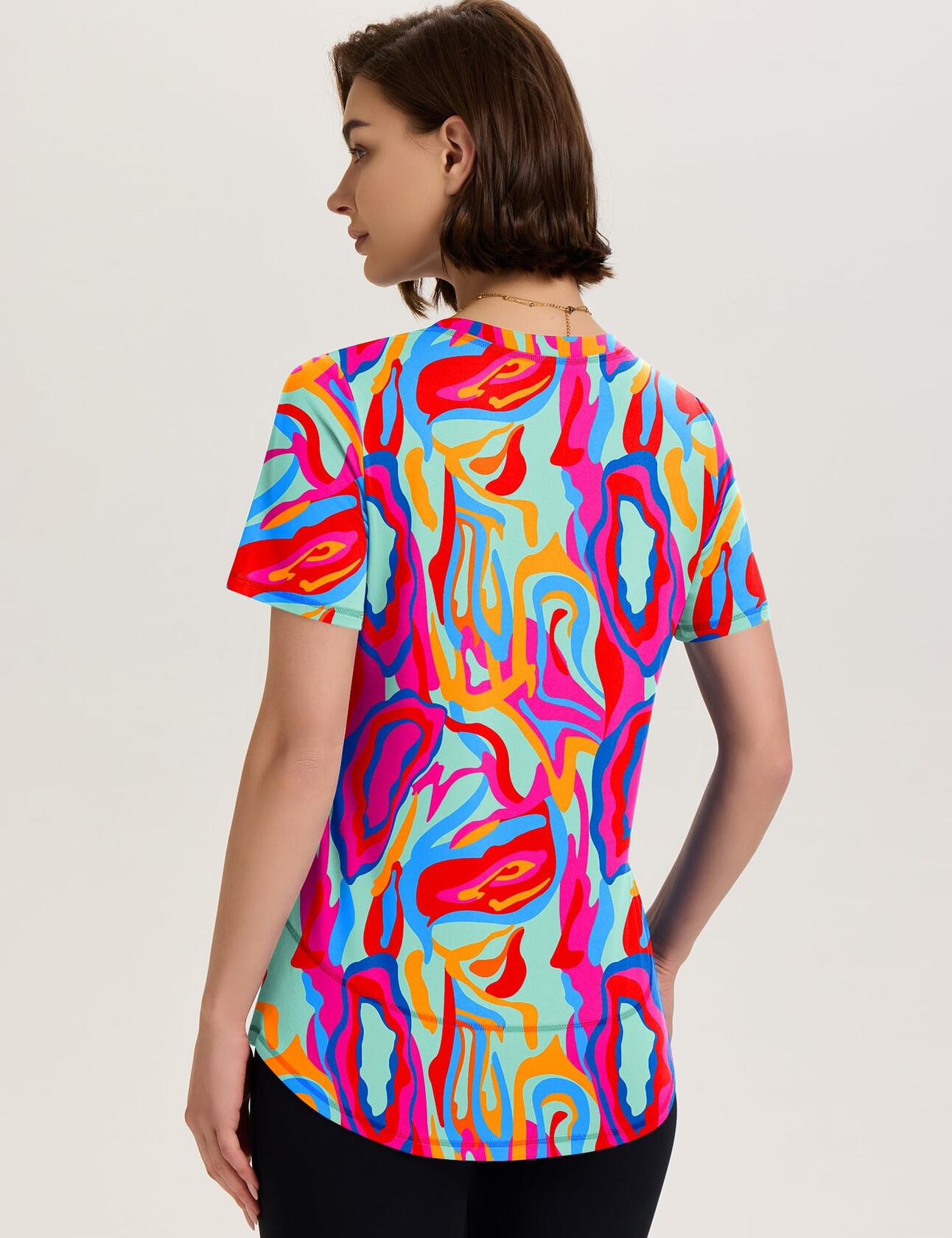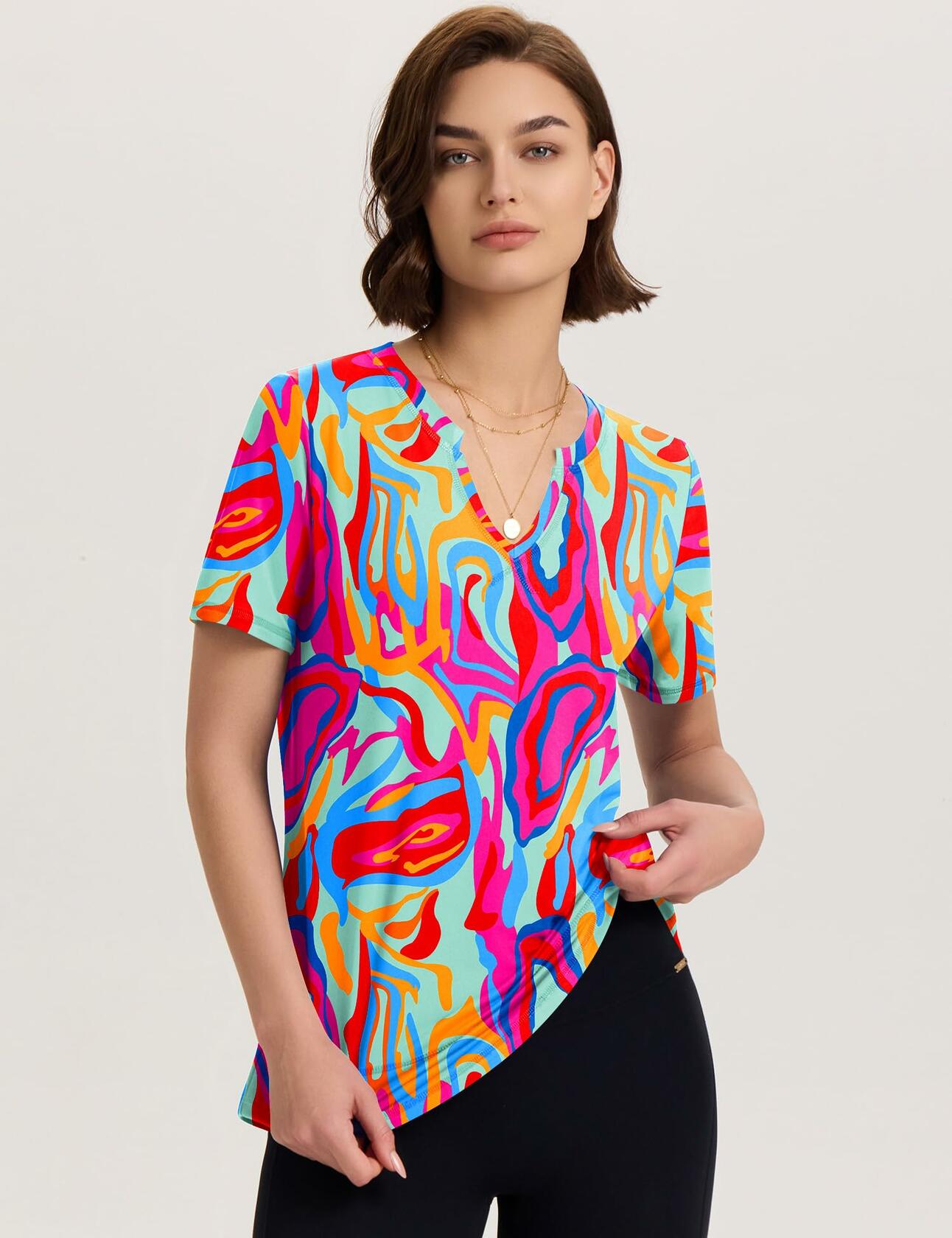 - Patterned stitching of the tops add attractiveness of the athletic tee shirt. Classic notch v neck design with curved hem, loose fitting shirt, with a nice stretch and falls nicely, easy to move without restriction, a great addition to summer workout clothes.