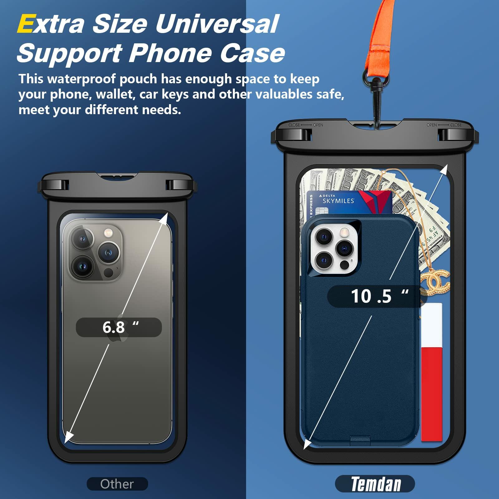 Temdan 2 Pcs Waterproof Phone Pouch, [Up to 10" Large] Universal IPX8 Waterproof Cell Phone Case Dry Bag with Lanyard for IPhone 16 Pro Max, 16 Pro, 16 Plus, 16, 16E, 15 Pro Max,15 Pro,15 Plus,15,14 Pro Max,14 Pro,14 Plus 14,IPhone 13 Pro Max,13 Pro,13,13 Mini,iPhone 12 Pro Max,12 Pro,12,12 Mini,iPhone 11,11 Mini,11 Pro,11 Pro Max, Xs Max, Xs, Xr, X,8,8 Plus,7 Plus, 7, 6s, 6s Plus, 6, 6 Plus 5s, 5, SE, 5C, 5, 4s iPod. Samsung Galaxy S25 Ultra S25+ Plus S25 S24 Ultra S24+ Plus S24 S23 Ultra S23+ Plus S23 S22 Ultra S22+ S22 S21 Ultra S21+ S21 S20 Ultra S20 S10 S10e S9 S9 Plus S8 S8 Plus Note 20 Ultra 20+ 20 10+ 10 9 8 S7 S7 edge S6 S6 Edge plus S5 S4 S3. Google Pixel 9/9 Pro/9 Pro XL/8/8 Pro Pixel 7/7 Pro Pixel 6 Pixel 5 Pixel 4 XL Pixel 4 Pixel 3,Play Z P30 P30pro Honor 5X 6X ,Zenfone Moto XT1644 ZTE Axon 7 Mini P9 P8 LG G6 G5 G4 G3 G2 V10 etc,HTC One M10, M9, M8, M7, Nexus 6, 6P, 5, 4 and other phone devices up to 10"