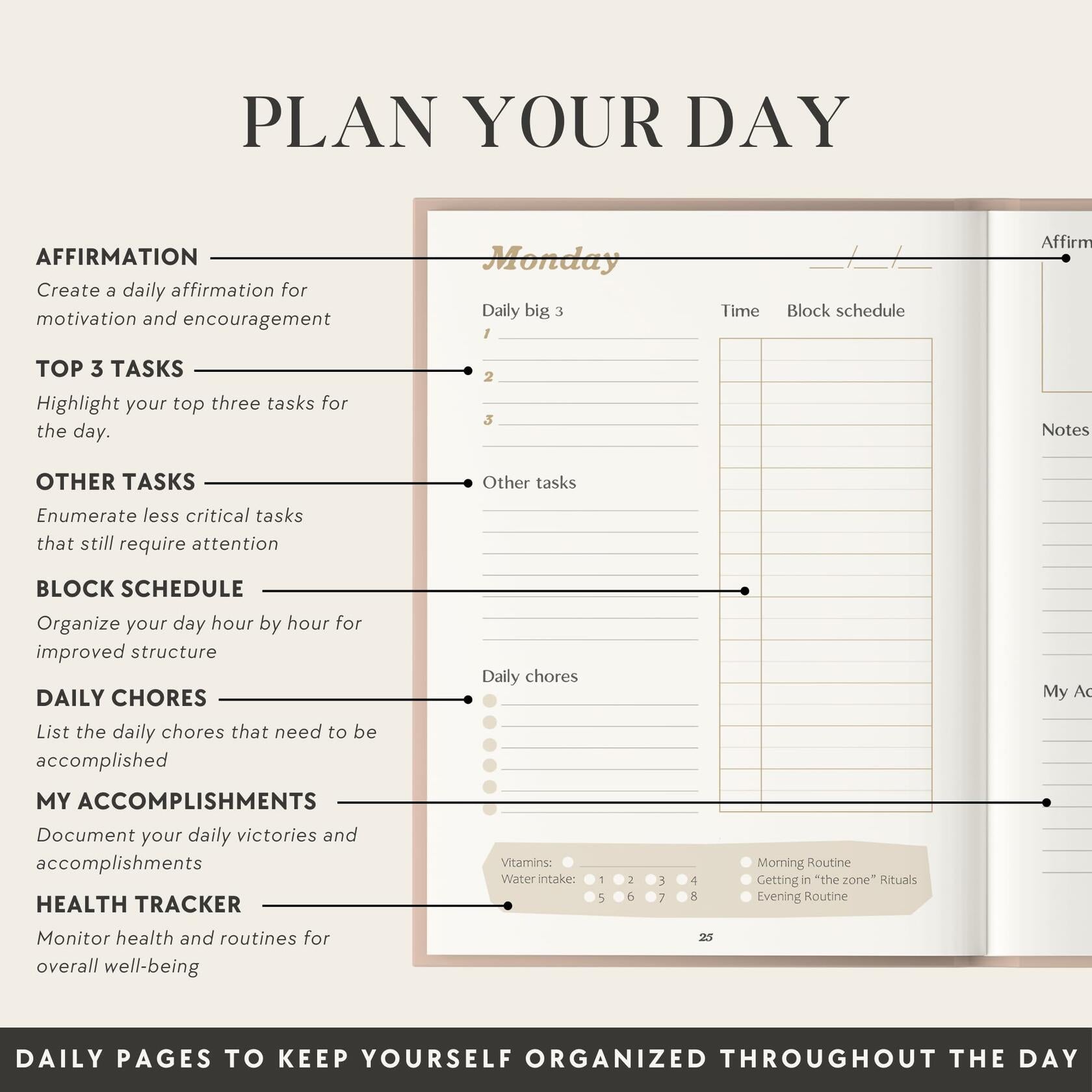 - GOAL PLANNER: Using this life organizer planner, you'll have dedicated spaces for setting your goals ahead of time. This will include longer-term goals that you can set your own time frames for, along with weekly overviews, a daily checklist, and an overall roadmap of where you want to be.