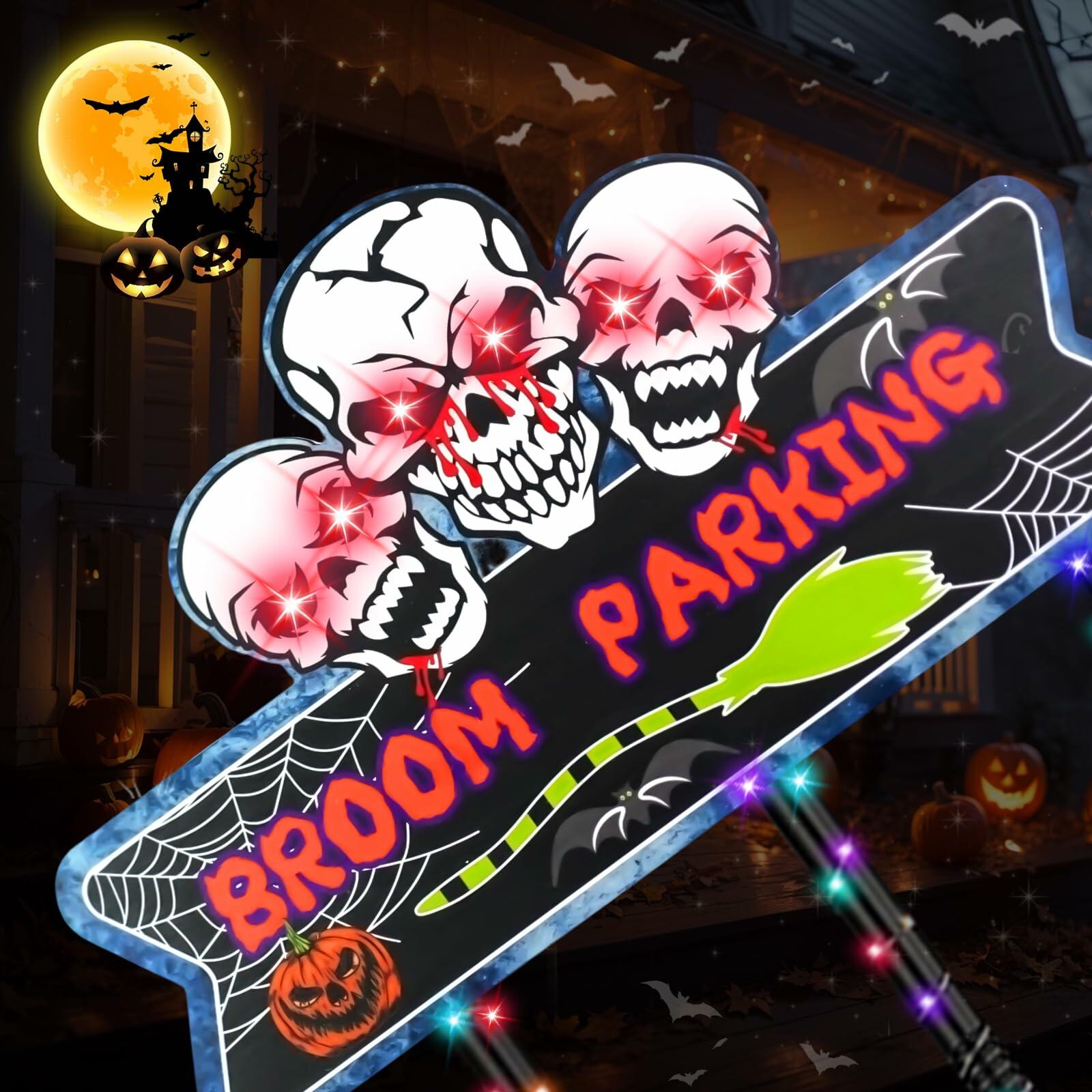 - Halloween Magic Broom Parking: The skull glows red, and the broom lights up in various colors. Combined with Halloween icons like spiders, pumpkins, bats, and blood, each broom has its unique color. With glowing lights to greet you, it creates a spooky yet fun Halloween atmosphere. The broom parking sign measures 45” x 15”