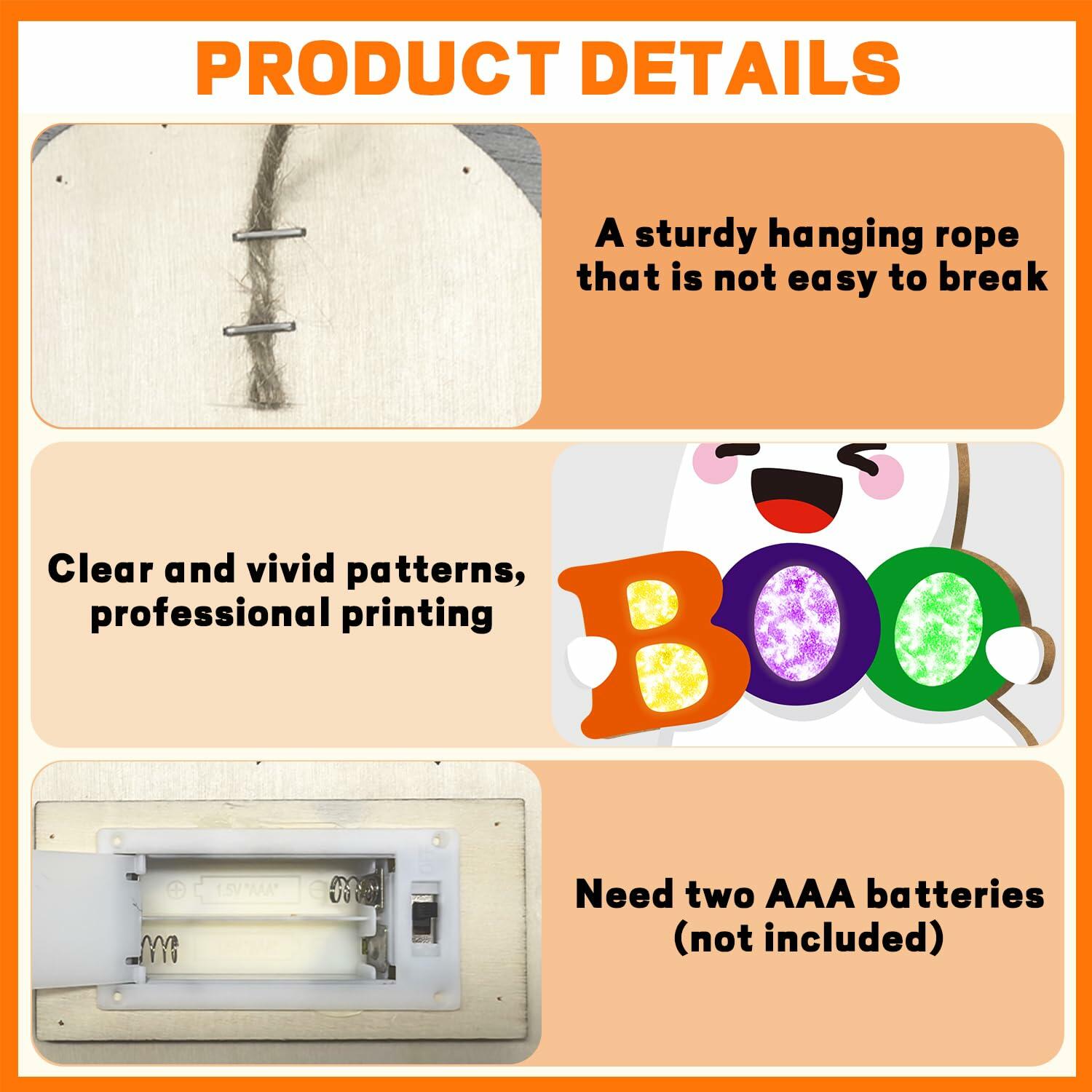 Crafted from weather-resistant wood with reinforced edges, this 12"x13" Halloween decorations outdoor piece withstands wind, rain, and chilly October nights. The energy-efficient LEDs (powered by 3 AA batteries* or included USB cord) deliver up to 80 hours of enchanting glow. Pre-attached jute rope ensures 30-second setup, while its festive gift-ready packaging makes it a boo-tiful surprise for friends, neighbors, or Halloween enthusiasts seeking standout Halloween door decor.