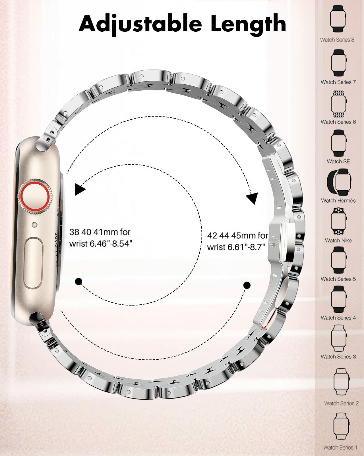 TISIMO Stainless Steel Metal Apple Watch Band Color:Sliver/Gold/Rose Gold/Sliver Gold/Sliver Rose Gold Design style:Water-drop design Compatible with model:Apple Watch Series 1/2/3(42mm),Series 4/5/6/SE(44mm),Series 7/8(45mm) Applicable gender:Women and men Packing list: 1 x complete iWatch band for Apple Watch 42mm 44mm 45mm, 1 x watch remover set, 1 x instruction manual