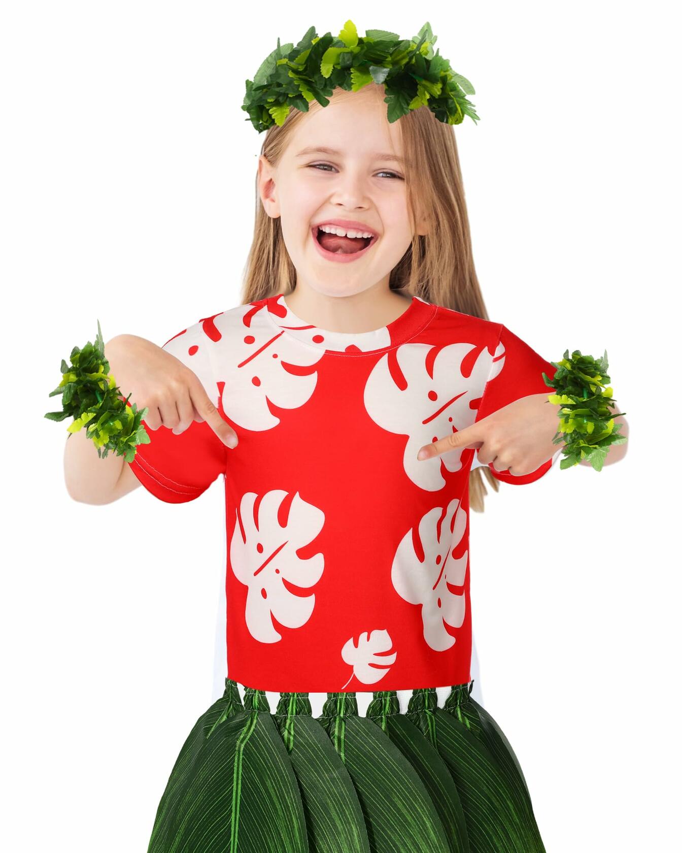 - Package Content: the package includes not just a T shirt, a hula leaf skirt, a pair of leaf anklets, a Hawaiian headband, and a pair of leaf bracelets, this total ensemble provides a comprehensive Hawaiian hula dance experience for your child