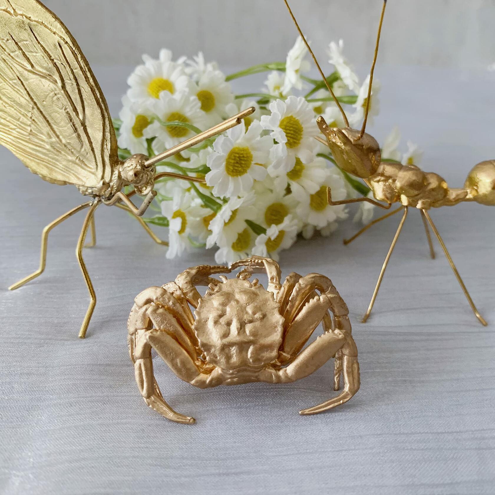 - HANDMADE METAL CRAB FIGURINE. The gold crab figurine is sculptured with metal material, polished gold and painted with waterproof pigments.